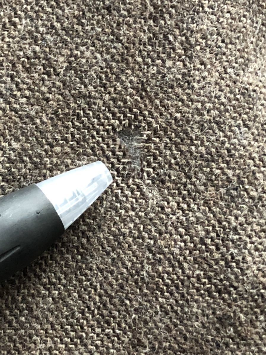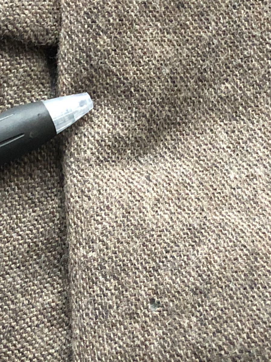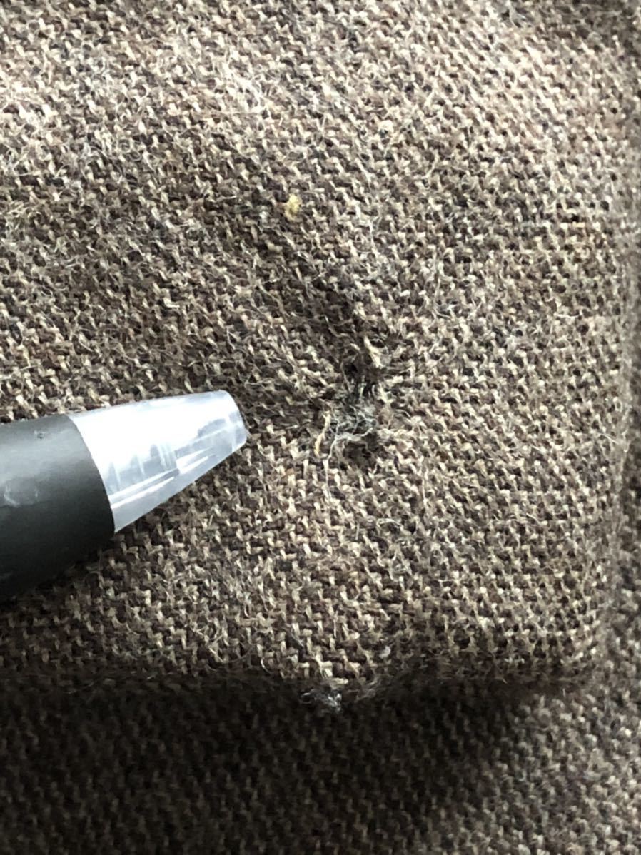 ・右ポケット下部、前左裾上、左袖前腕に小穴がございます。