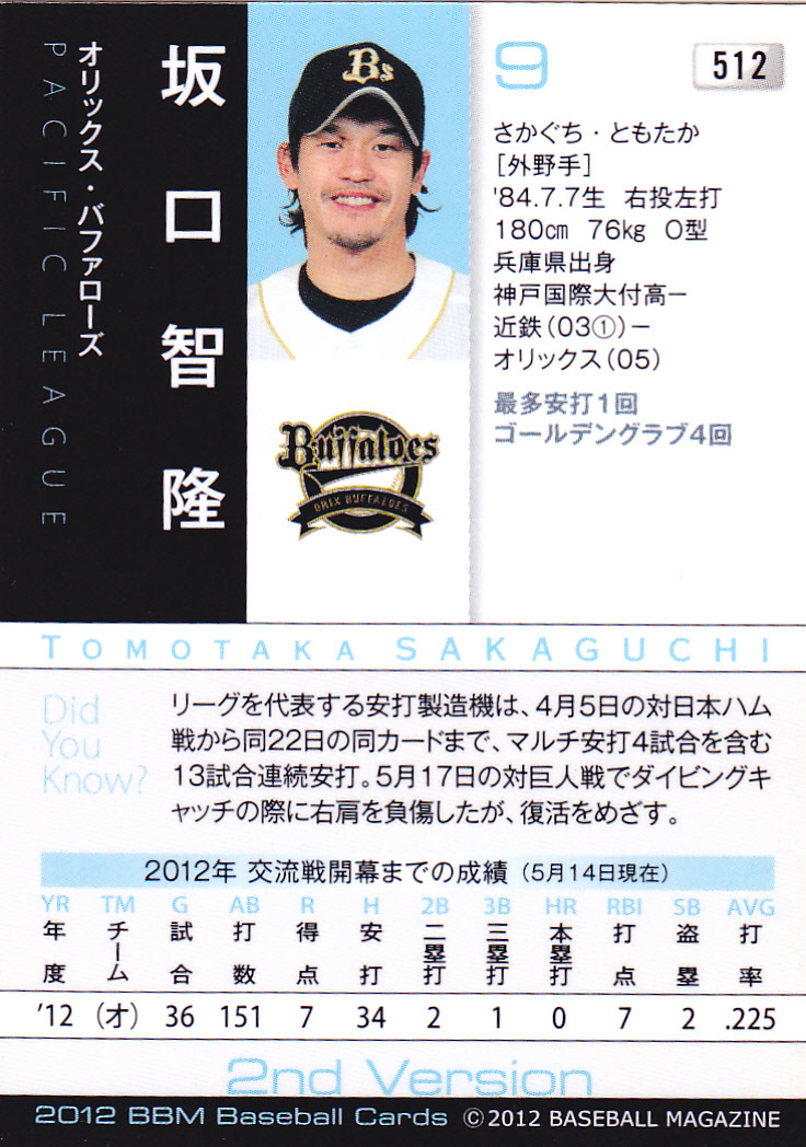 BBMベースボールカード 2012-2nd 512 坂口智隆 オリックス・バファローズ 兵庫県 神戸国際大付属高校 ドラフト1位 近鉄