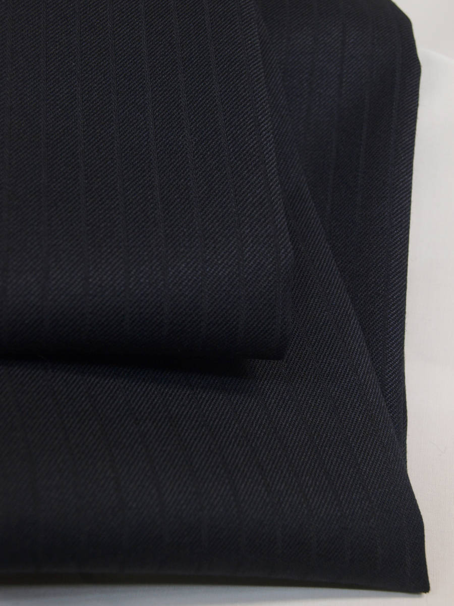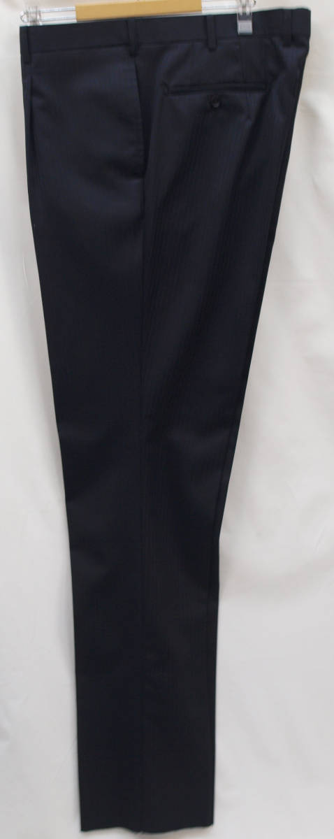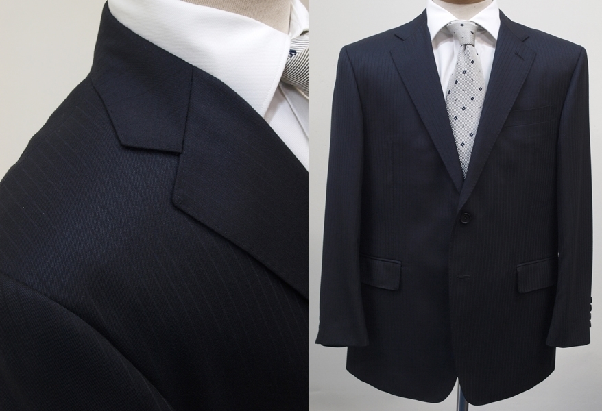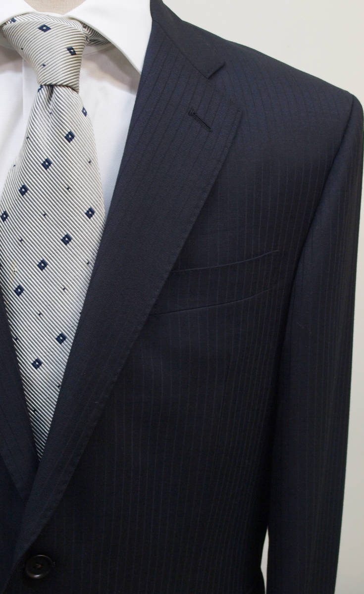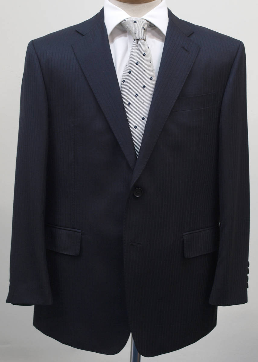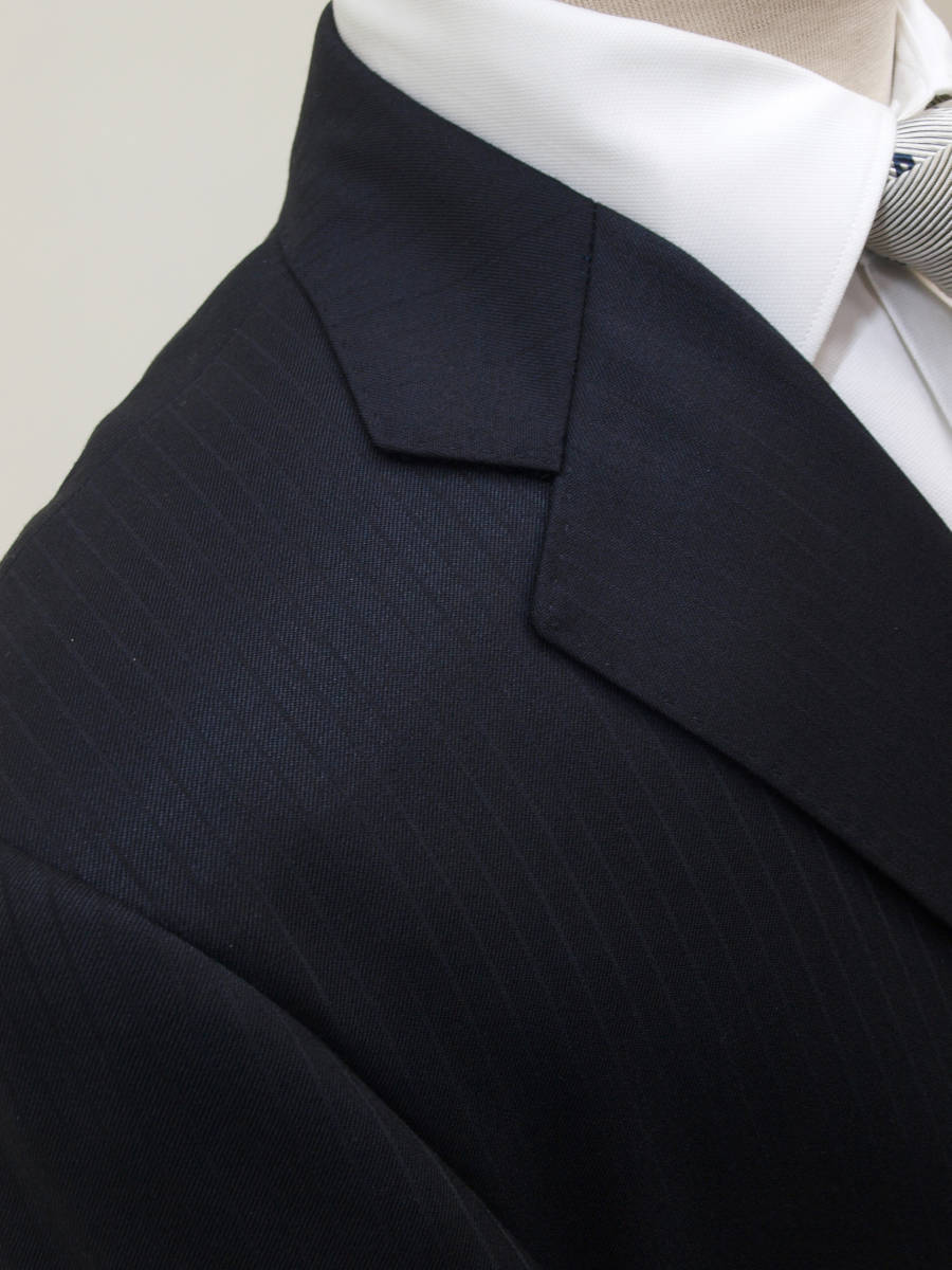 【サイズ】 E4(ES号サイズ相当) 目安の体型 身長160cm~170cm、ウエストサイズ98cm前後 【ジャケット実寸】 肩幅48cm 着丈71cm 袖丈58.5cm 脇下部分57cm 身幅55cm 【パンツ実寸】 ウエスト(胴回り実寸)98cm わたり幅34.5cm(股下10cmの部位で31cm) 裾幅21.5cm 脇股上28cm 前股上30cm 股下89cm(裾上げしていない状態/新品) 【素材】 表地:ウール50% ポリエステル50% 裏地:胴裏/ポリエステル100% 袖裏/キュプラ100% 冬物としてはあまり厚みのない適度な厚みの秋冬春向け紳士スーツ用のウールブレンド素材を使用 【色】 黒色 【柄】 黒色のラインが7mm間隔ではいったコードストライプ柄 【デザイン】 ほどよいゆとりのある楽な着心地のシングル2つボタンスーツ、レギュラーフィット、ビジネススーツ新品、裾上げしていない状態です。 ・ジャケットはシングル2つボタンですっきりとしたシルエットですがややゆとりがある着用感のベーシックレギュラーモデル ・パンツは股上は浅くなく普通で、適度なゆとりをもたせたレギュラーフィット、1タックパンツ 秋冬メインのシーズン対応商品ですが、秋冬物としては薄手の素材で背抜き仕様となっておりご着用の地域にもよりますが真夏、真冬を除くほぼオールシーズン対応のテンマンススーツです。 【縫製仕様】 ・ジャケットはシングル2つボタン、ノッチドラペル、襟縁等AMFステッチ入り、袖口ボタン4つ、センターベント、内ポケット4つ(小ポケット2つ含む)、背抜き仕様 ・パンツはワンタック、膝裏当て付き、脇ポケット斜め付け、後ろポケット両玉縁で左のみボタン付き、フロントはファスナーでボタン&ホック仕様/うちかけボタンあり きれいな縫製仕立てできちんとしたビジネススーツの仕様で仕上がっております。