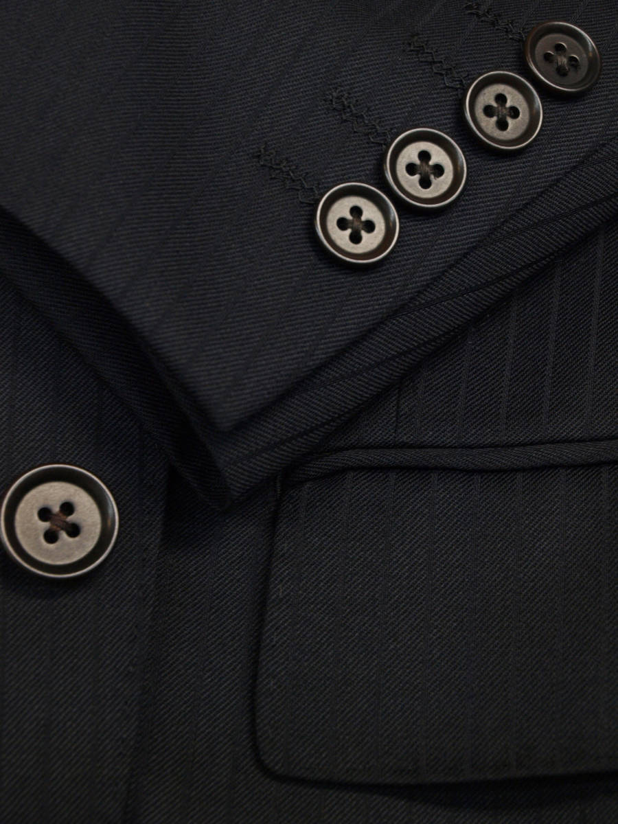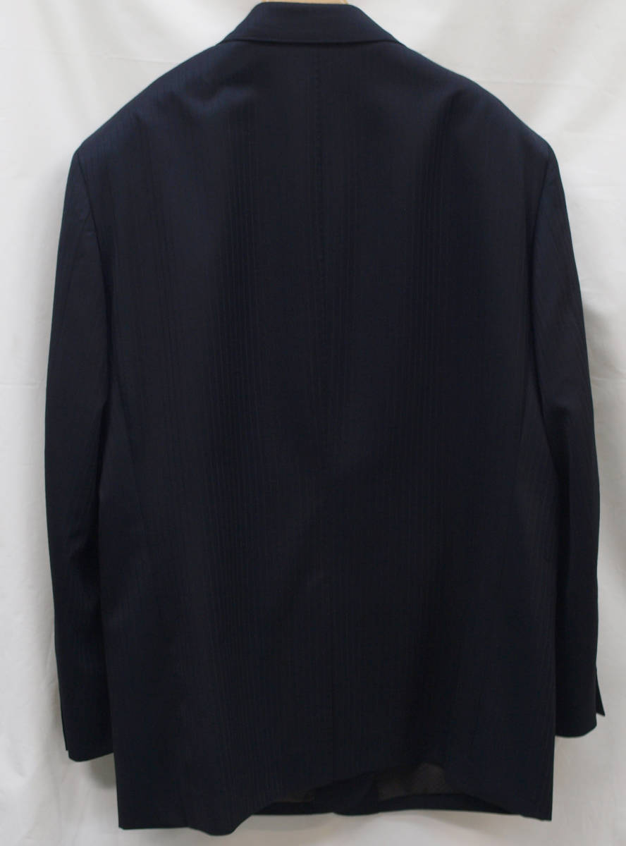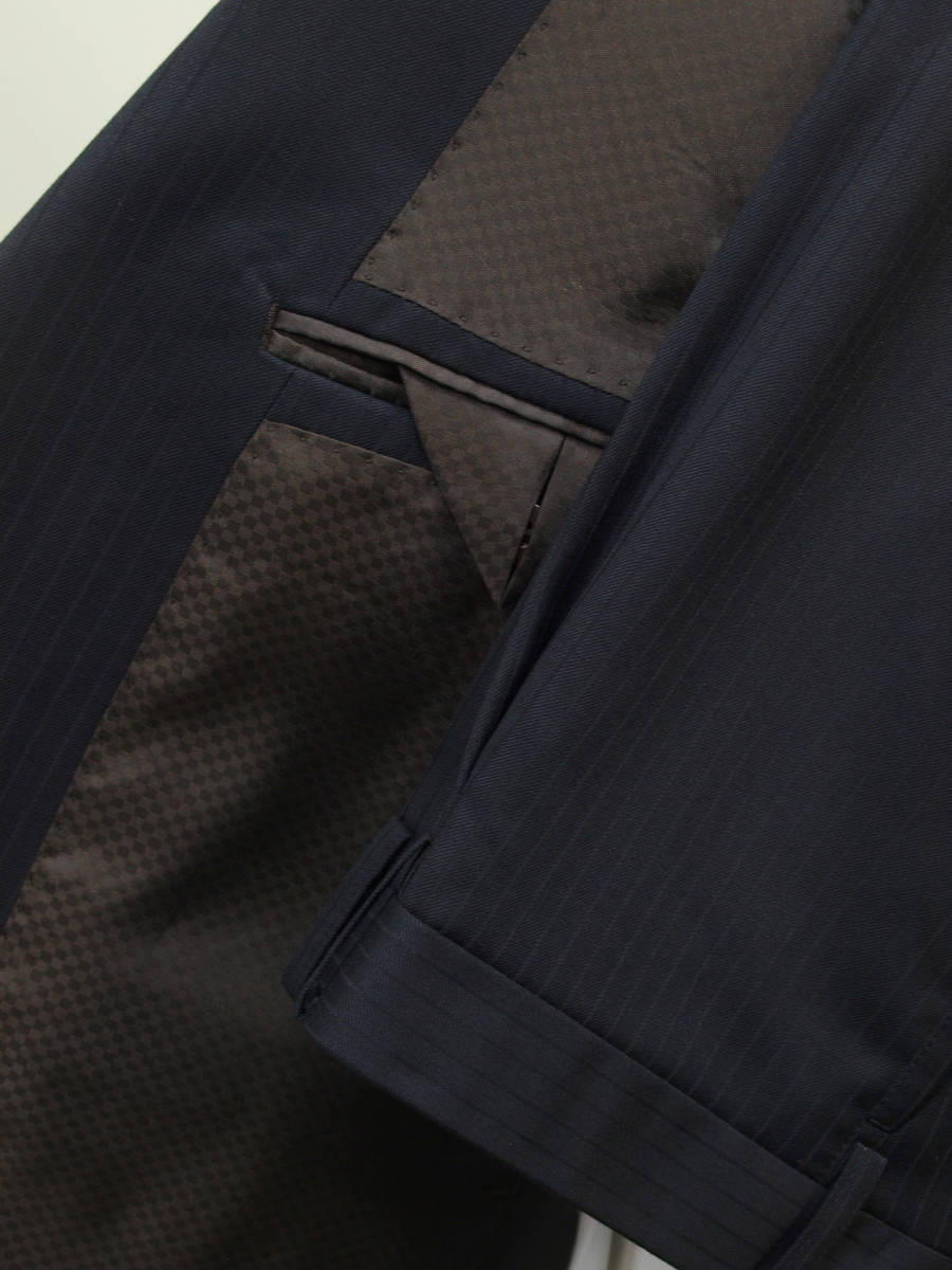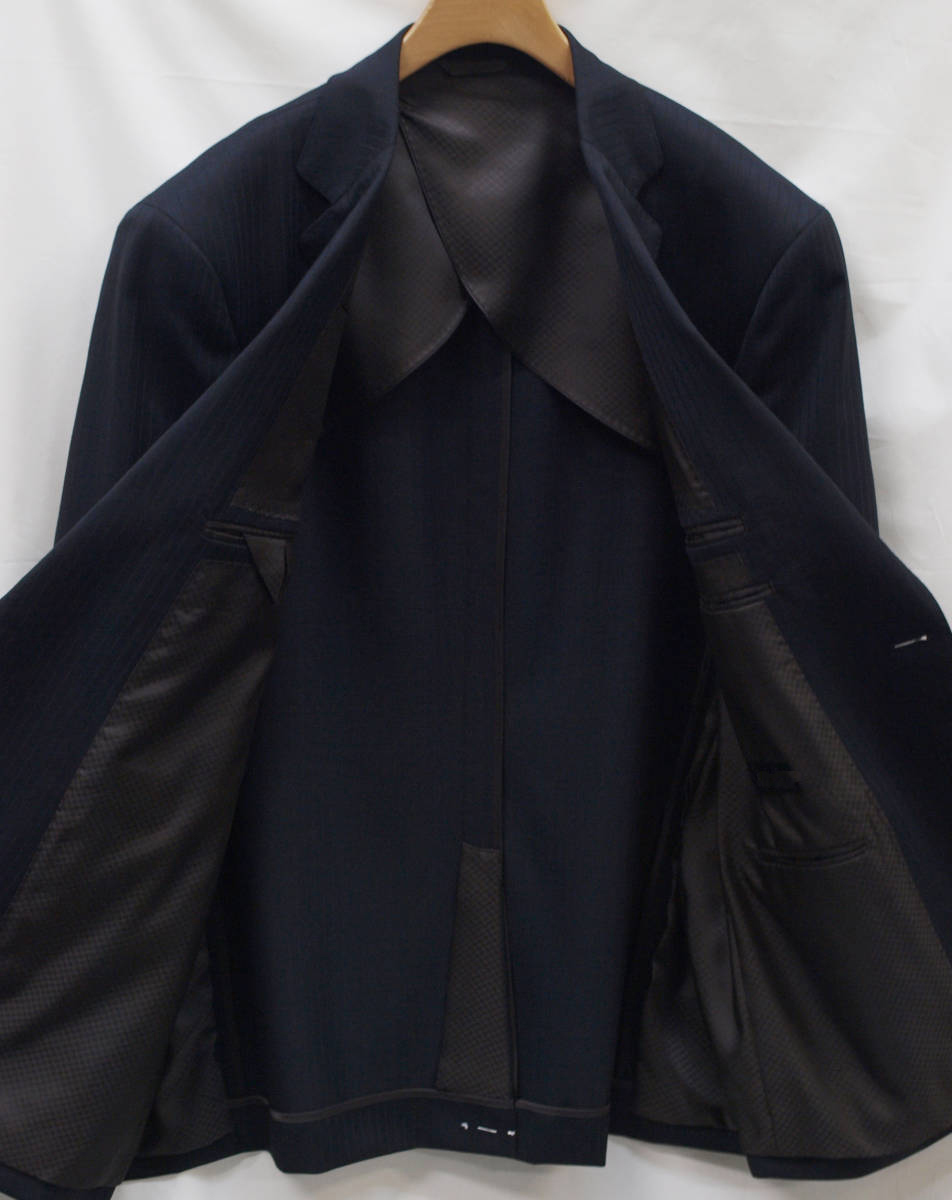【サイズ】 E4(ES号サイズ相当) 目安の体型 身長160cm~170cm、ウエストサイズ98cm前後 【ジャケット実寸】 肩幅48cm 着丈71cm 袖丈58.5cm 脇下部分57cm 身幅55cm 【パンツ実寸】 ウエスト(胴回り実寸)98cm わたり幅34.5cm(股下10cmの部位で31cm) 裾幅21.5cm 脇股上28cm 前股上30cm 股下89cm(裾上げしていない状態/新品) 【素材】 表地:ウール50% ポリエステル50% 裏地:胴裏/ポリエステル100% 袖裏/キュプラ100% 冬物としてはあまり厚みのない適度な厚みの秋冬春向け紳士スーツ用のウールブレンド素材を使用 【色】 黒色 【柄】 黒色のラインが7mm間隔ではいったコードストライプ柄 【デザイン】 ほどよいゆとりのある楽な着心地のシングル2つボタンスーツ、レギュラーフィット、ビジネススーツ新品、裾上げしていない状態です。 ・ジャケットはシングル2つボタンですっきりとしたシルエットですがややゆとりがある着用感のベーシックレギュラーモデル ・パンツは股上は浅くなく普通で、適度なゆとりをもたせたレギュラーフィット、1タックパンツ 秋冬メインのシーズン対応商品ですが、秋冬物としては薄手の素材で背抜き仕様となっておりご着用の地域にもよりますが真夏、真冬を除くほぼオールシーズン対応のテンマンススーツです。 【縫製仕様】 ・ジャケットはシングル2つボタン、ノッチドラペル、襟縁等AMFステッチ入り、袖口ボタン4つ、センターベント、内ポケット4つ(小ポケット2つ含む)、背抜き仕様 ・パンツはワンタック、膝裏当て付き、脇ポケット斜め付け、後ろポケット両玉縁で左のみボタン付き、フロントはファスナーでボタン&ホック仕様/うちかけボタンあり きれいな縫製仕立てできちんとしたビジネススーツの仕様で仕上がっております。