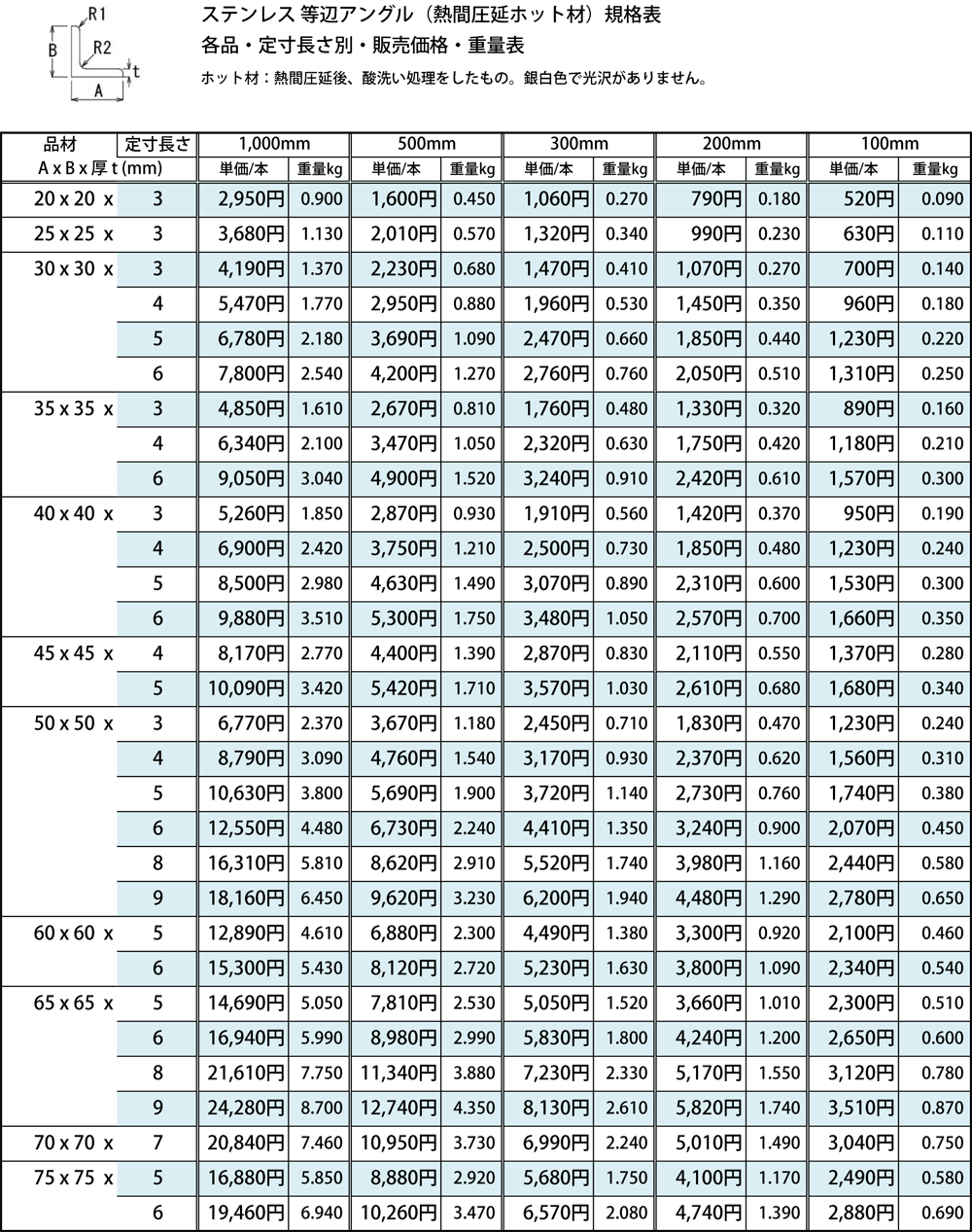 ステンレス 等辺L形 未研磨ホット材(SUS304) 各品形状の