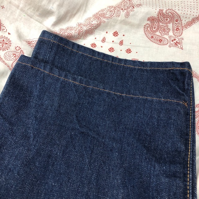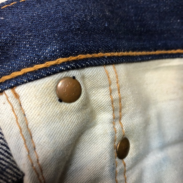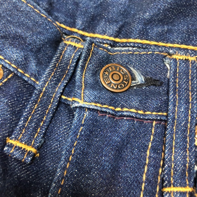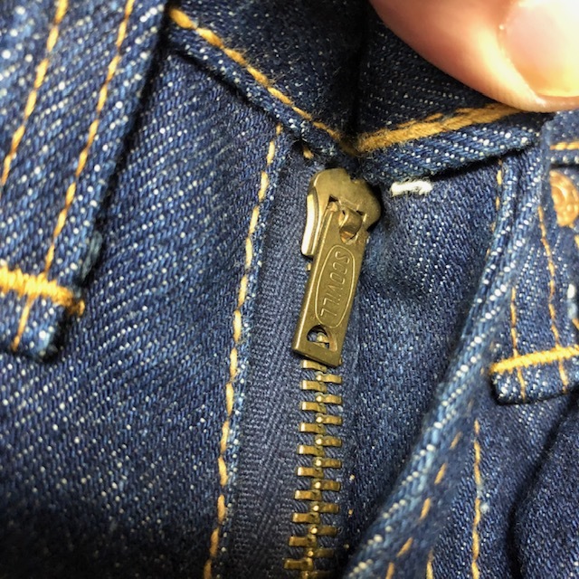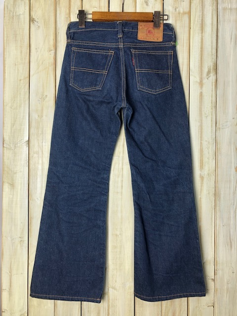●商品説明・・・70年代の国産オールド・ヴィンテージのBIGSTONE(ビッグストーン)のベルボトムまで極端ではないですが、裾がフレアに広がっているデニムパンツです(LOT A601)。この頃はアメリカ製のデニム生地を使用して日本で縫製されているので、リーバイスの66のような綺麗な経年変化するデニム生地で、ジッパーもSCOVILLです。数回ウォッシュ程度のしっかり濃紺のインディゴデニム生地でこれから履き込んでいただける国産ヴィンテージデニムパンツです。