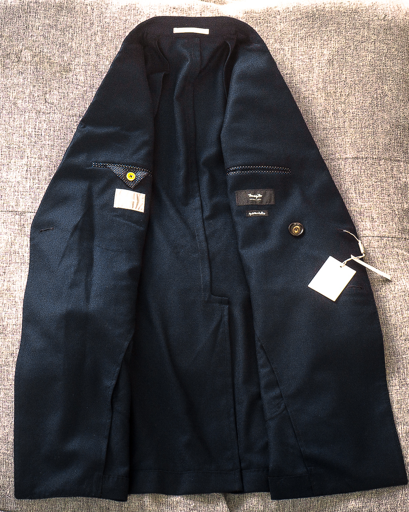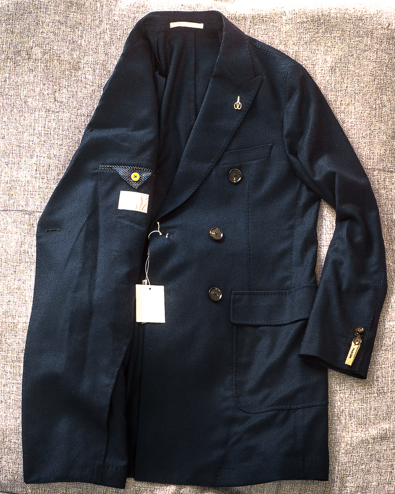 フラワーラペルにはテーラーを連想させるハサミモチーフのピンが施されています。日本ではまだ取扱いの少ないブランドながら本国イタリアでは老舗として広く知られた存在です。