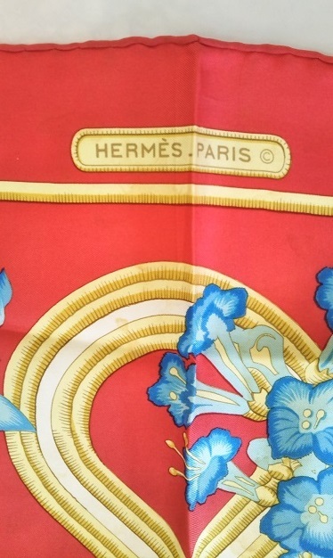 HERMES エルメス フランス製 大判スカーフ カリブ 鳥 レッド 青