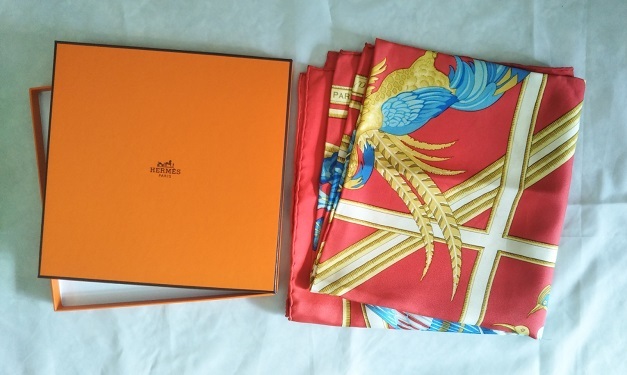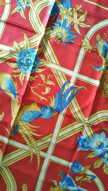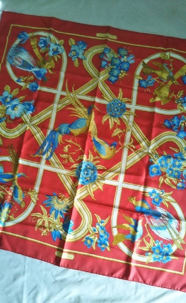 エルメス シルク100% スカーフ カリブ 鳥 レッド 青