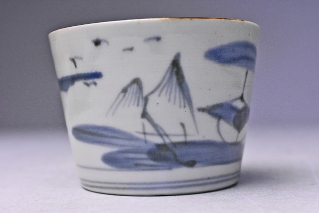 古伊万里 そば猪口 です。 山水文 に 広さを 感じる 逸品です。 口辺に ホツがあります。 箱はありません。