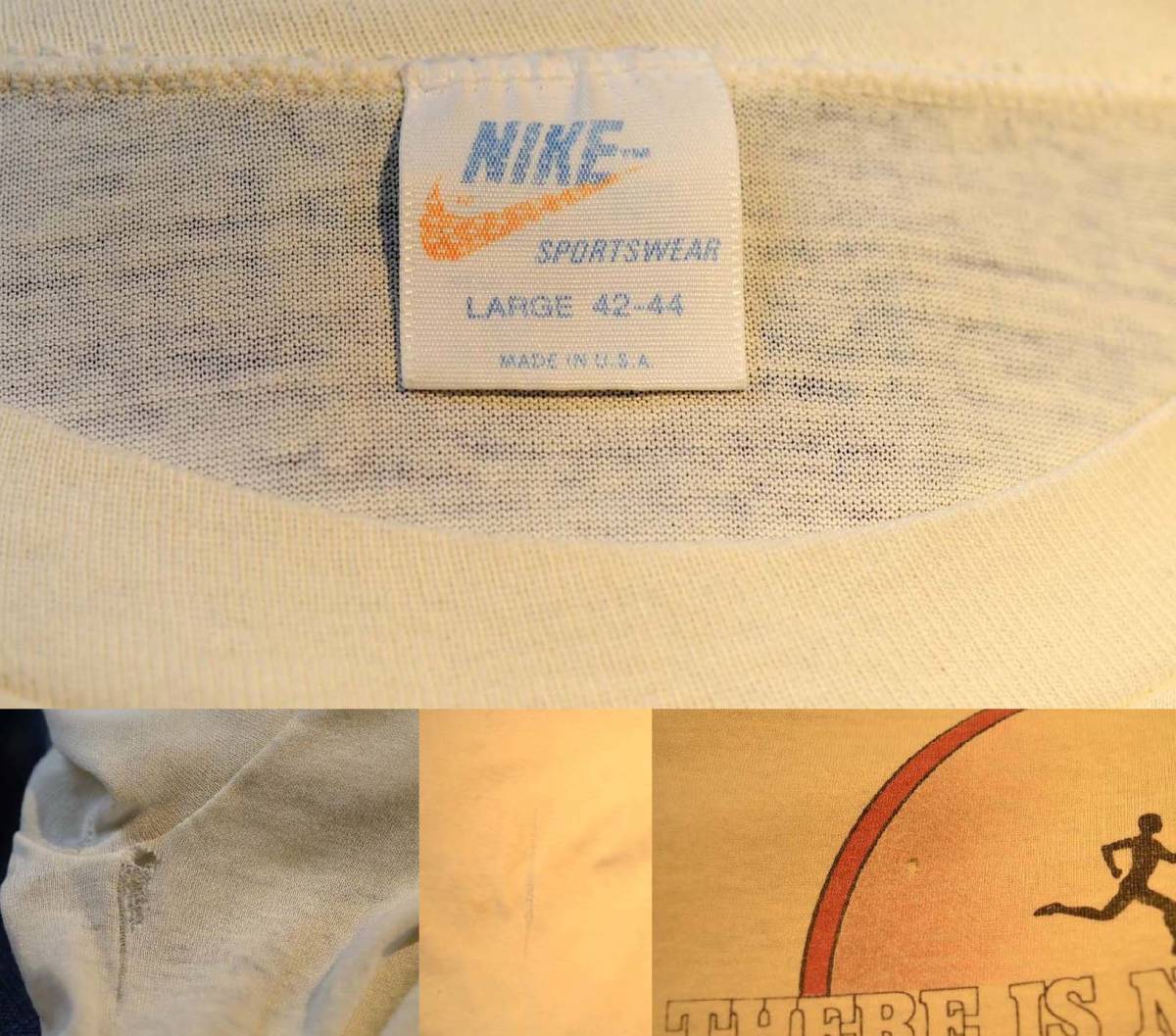 70'sと思われるヴィンテージ、オリジナルのNIKEオレンジタグマラソンTシャツです。レプリカ、復刻ではありません。コットン50%、ポリ50%のアメリカ製です。 所々ダメージがあります。全てではありませんが、写真を撮りましたのでご確認ください。古着好きの方でしたら普通に着用いただけると思います。 オールドナイキファンの方は是非いかがでしょうか。