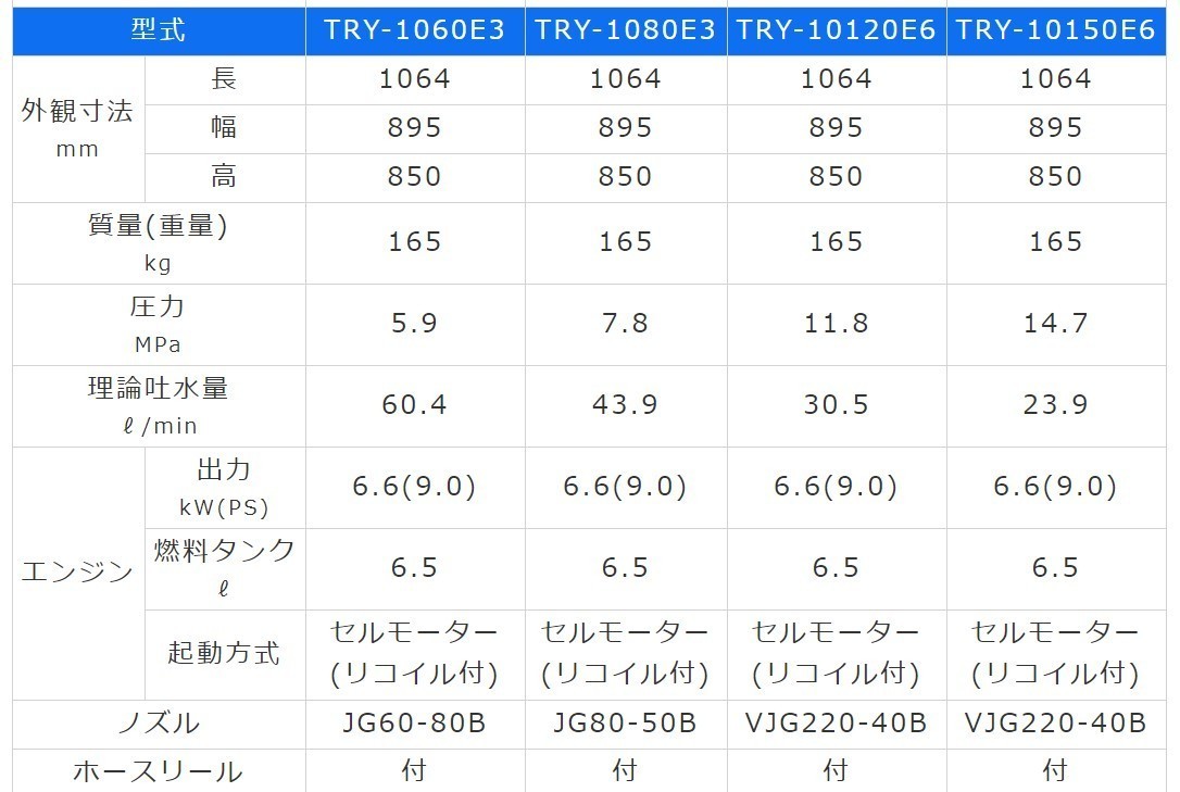 【商品詳細】 【有光 TRY-10120E6 高圧洗浄機 エンジンタイプ 】 外観寸法 長mm/幅mm/高mm: 1064×895×850 質量(重量)kg :165 圧力 MPa:11.8 理論吐水量 l/min: 30.5 エンジン 出力kW(PS) / 燃料タンク l : 6.6(9.0)/6.5 起動方式 :セルモーター (リコイル付) ノズル :VJG220-40B ホースリール:付 ■写真は、イメージです。 メーカーホームページはこちらから有光工業株式会社 重量物は法人様のみ車上渡し元払いになります。 個人様は、運送会社様の営業所止めになります。 ※仕様は予告なく変更になることがございます。 ※下記注意事項の確認をお願いいたします。