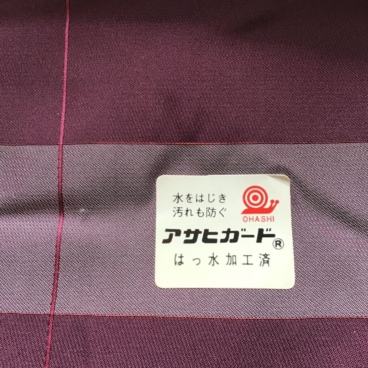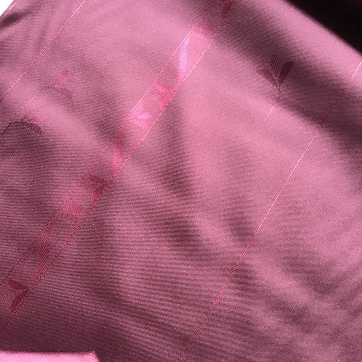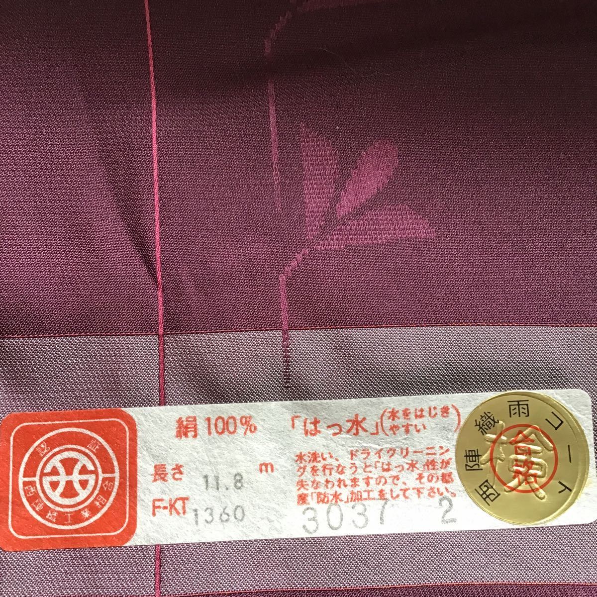 正絹の上品な光沢ある生地で、紫とあずき色を混ぜたような素敵な色に、極細ラインと柄が縦に入ってスタイル良く見える柄です♪