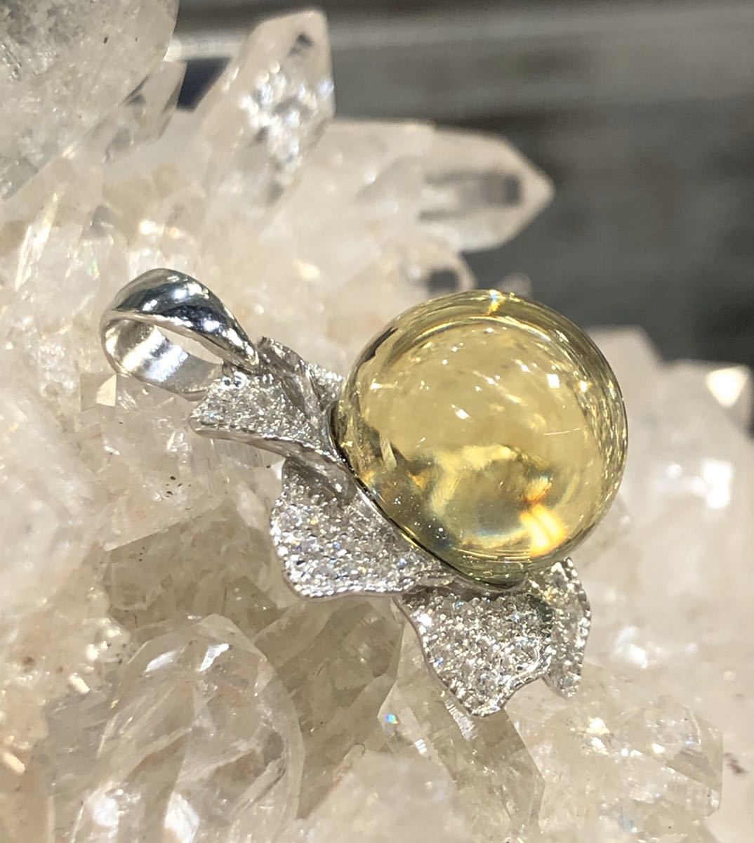 一見普通のアンバーとはなんら変りはないですが、太陽光やブラックライトなどの紫外線が当たると神秘的な美しいブルー光が表面を覆います。