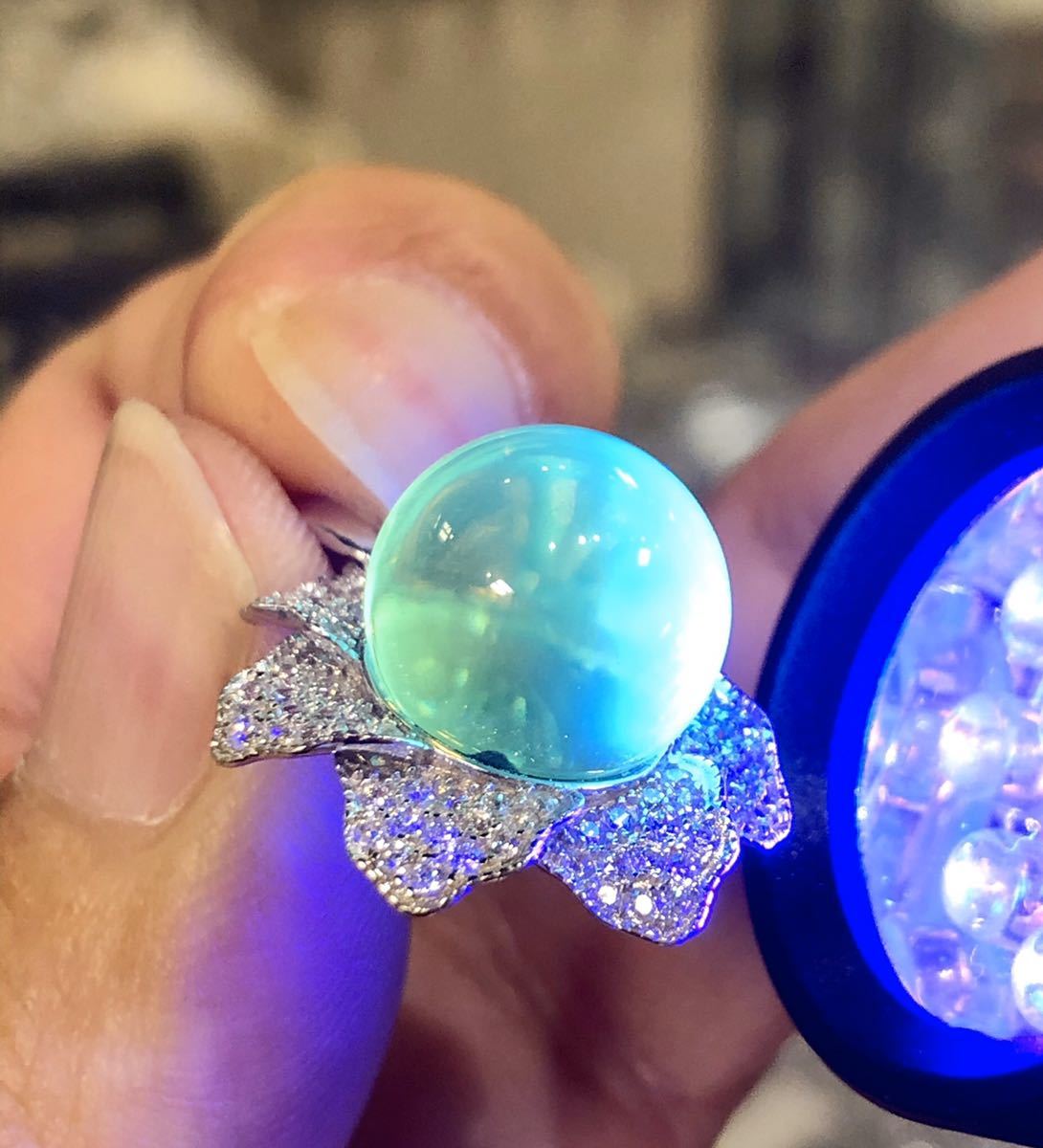 原因は火山の影響で琥珀の中に微量の金属のイオンが含まれ、このような蛍光効果のブルーになるそうです。