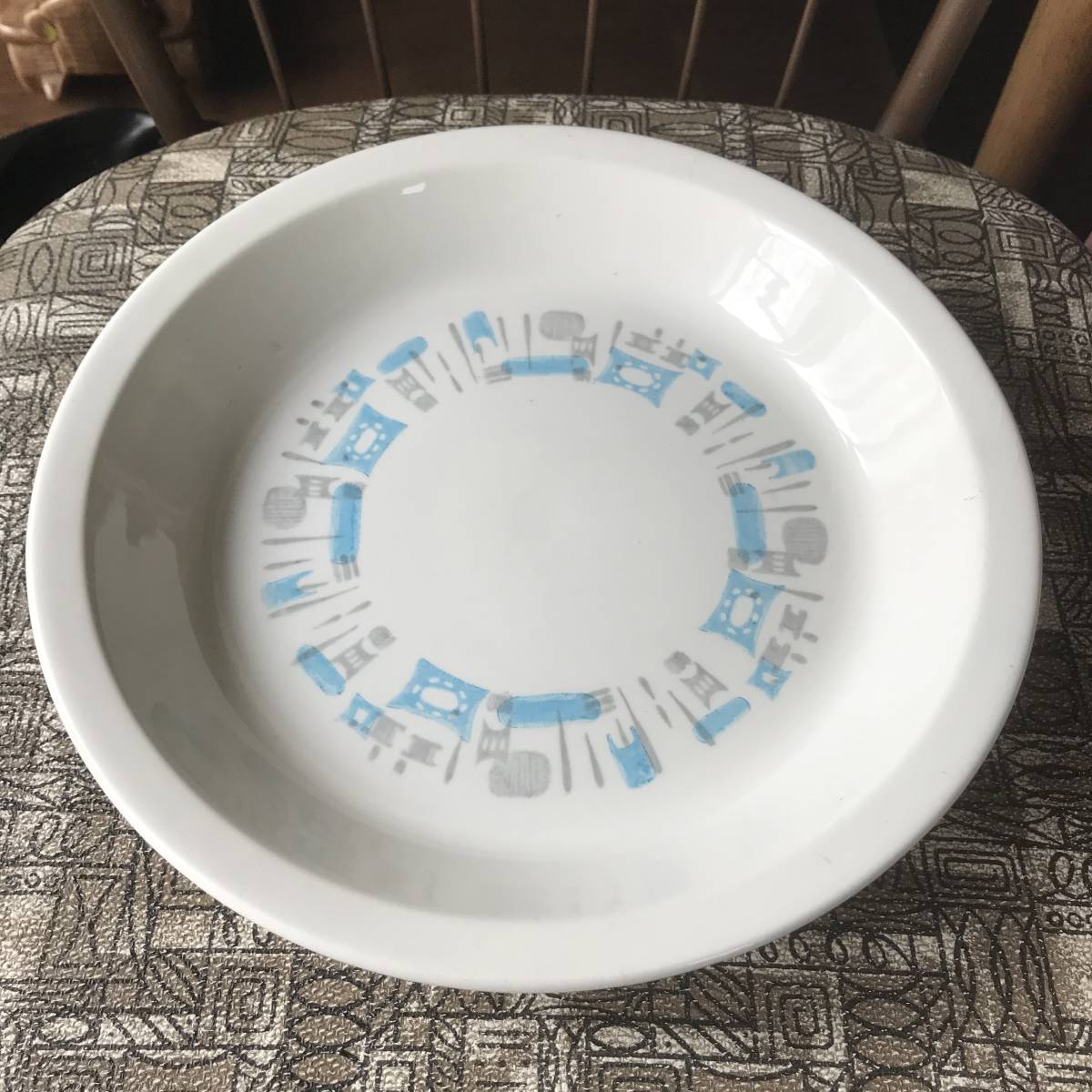の食器になります。ブルーヘブン!アメリカミッドセンチュリーの貴重な食器です。サイズは直径約25.5cm、高さ約4cm、一緒に写してる100円玉と比較参照して下さい。カケやヒビなどはなく程度は良好です。古いものですので神経質な方はお控え下さい。ビンテージにご理解ある方 よろしくお願いします。