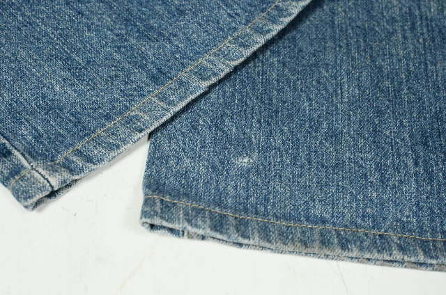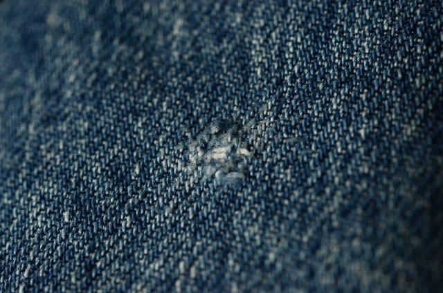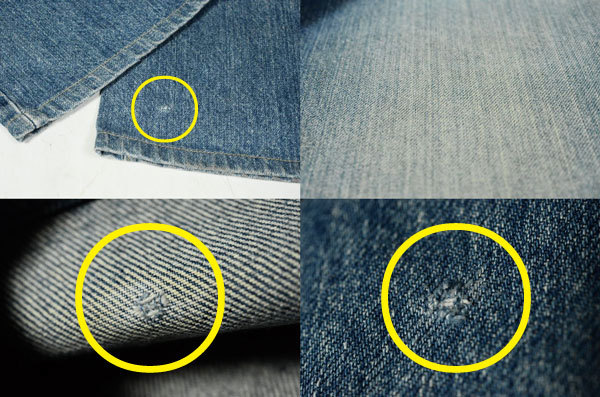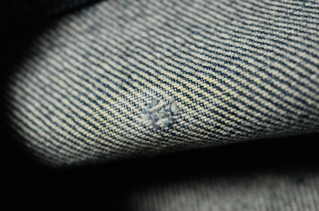 太さの異なる経糸を数種類使い分けており、過剰な縦落ちがみられるジーンズです。
