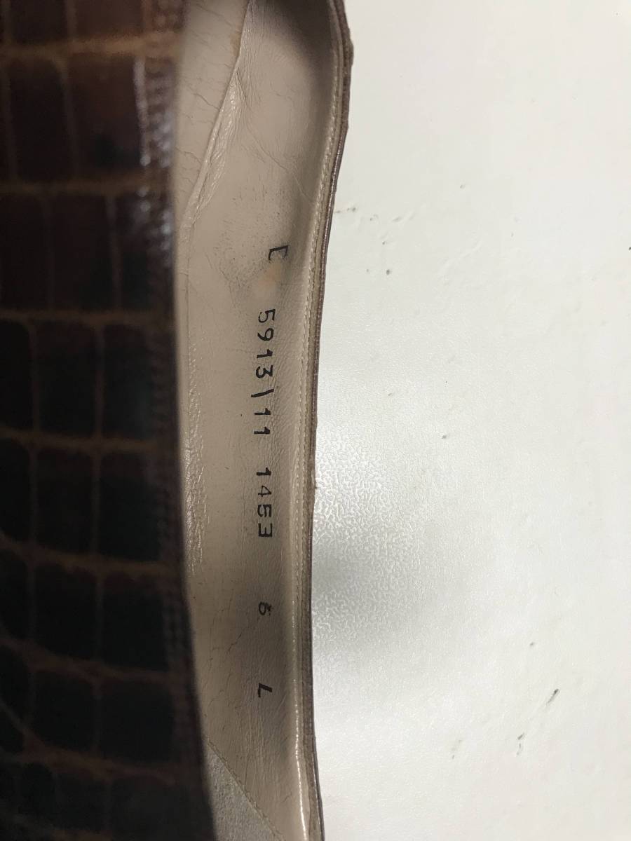 **当ページをご覧頂き、誠にありがとうございます。必ず、自己紹介文を確認の上、入札をして頂くようお願い致します** ※※※定期的にお値下げ、お品物のアップをしているので是非アカウントのフォロー&ウォッチをお願いいたします!※※※ ***商品説明*** ★Salvatore Ferragamo フェラガモ クロコ型押し パンプス★size 6★レザー ブラウン★ ★***カラー***★ ブラウン ★***素材表記***★ ★***状態***★ 10段階評価中:6~7 ヒール部分劣化あり <状態について> ☆(10).dead stock:新品、未使用品。 ☆(9).mint:殆ど使用感のない美品。 ☆(8)very good:数回程度しか使用されていない美品。 ☆(7)good:使用感はあるが、目立つダメージのない物。 ☆(6)USED:気にならない程度のスレやキズがあるだけの物。 ☆(5)USED:使用感があり目立つキズやシミがある物。 ☆(2)~(4)USED:非常に目立つキズやシミがある物。 ☆(1)outlet:使用するには難有りな物。修復が必要な物。 ”ボディ全体の雰囲気はランク8だが、脇に穴のみがあった”など、一点一点状態が異なりますので、番号は参考程度に、ランク番号右に備考があればそちらもご覧くださいませ。 ★***サイズ(平置き採寸(cm))***★ ★***サイズ(本体表記)***★ 6表記あり |