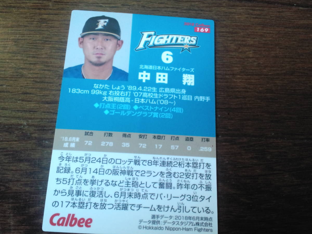[同梱可]★中田翔(北海道日本ハムファイターズ)☆レギュラーカード(169)★2018年カルビープロ野球カード第3弾☆