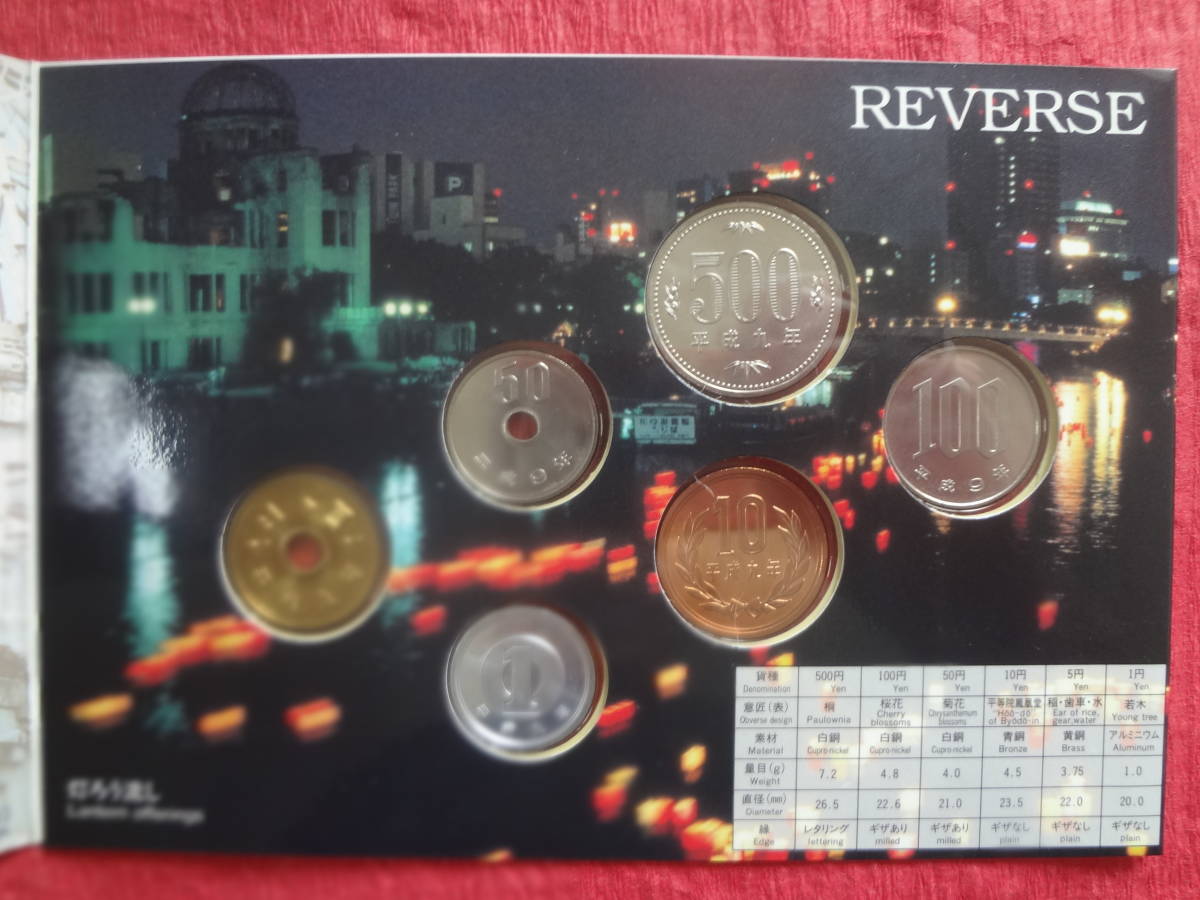 この貨幣セットは、広島市の原爆ドームが世界文化遺産として登録されたことを記念して、造幣局で製造した平成9年銘の貨幣(500円、100円、50円、10円、5円、1)1枚を一度も使用していない状態で、登録地域のカラー写真(和・英文説明付き)入りのケースに収納した貨幣セットです。