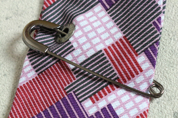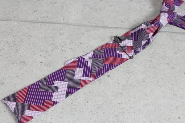 奇麗な配色の柄を使用した、高級感のある大きめの安全ピンが特徴の非常に上品なネクタイです。