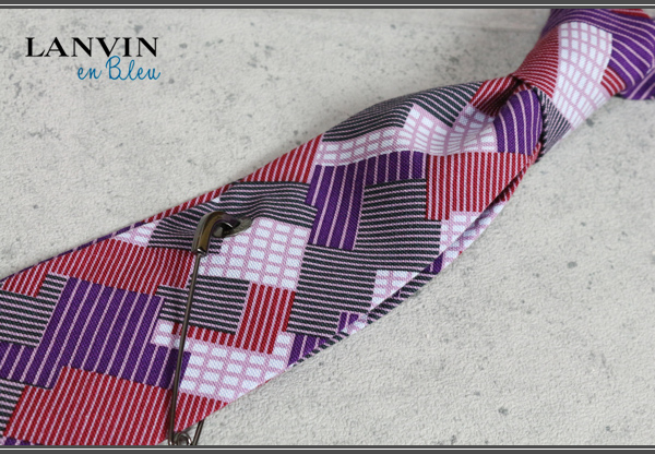 新品ランバン オン ブルー日本製安全ピン幾何学模様ネクタイ紫