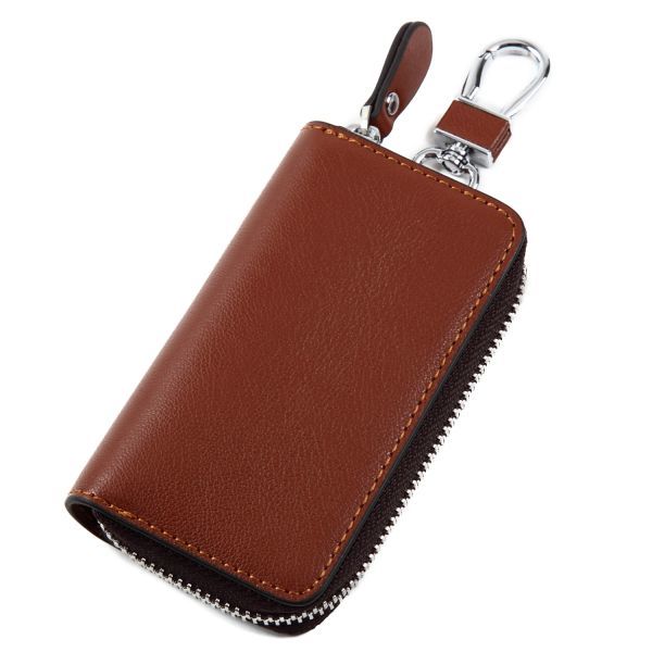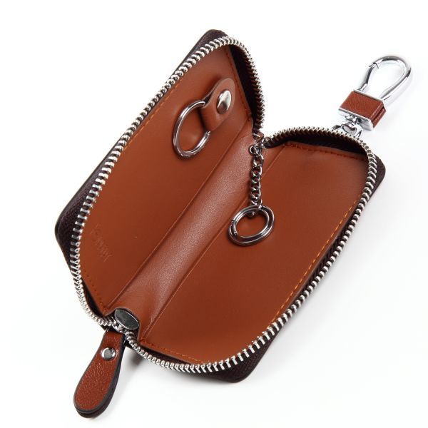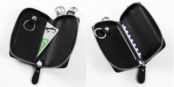 ファスナー式でしっかりと収納できるスマートキー専用ケースです。チェーン付きキーリングも付いているので、家の鍵や大切な鍵なども一緒に収納できます。またスナップボタンで脱着できる「ボタン付きキーリング」も付いていますので、スマートキーをパット取り外して素早く使えます。