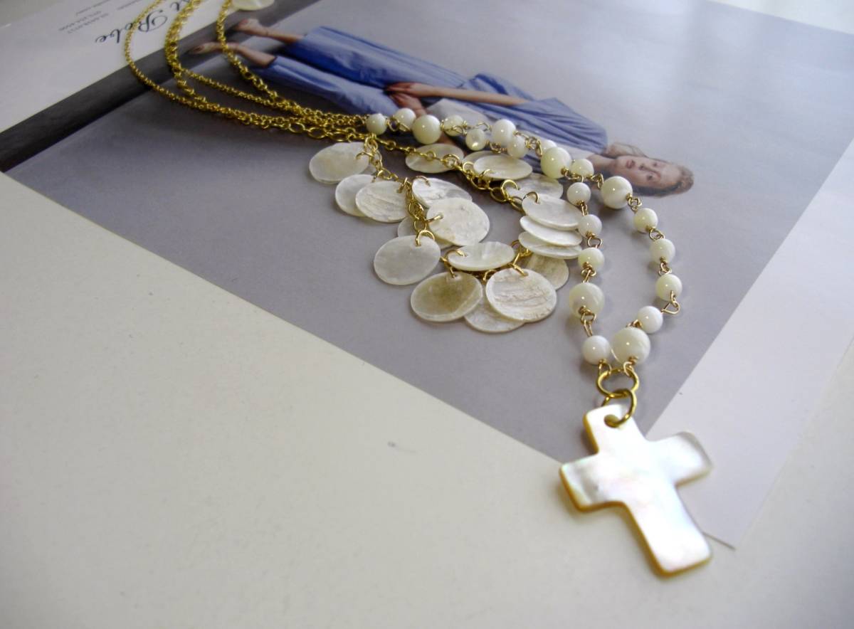 夏色・見本帖・・シェルの魔法・ナチュラルな色合いが素敵なシェルのネックレス2点セットです♪薄いラウンドシェルや大きなクロスのシェルが大人のロマンチックしています♪15ミリ位のラウンドシェルはデザインチェーンに繋いでキュートな表情です♪長さは全長70センチ位で調節自由です♪チョーカー風に着けても可愛いです♪6ミリから8ミリ位までの丸玉のシェルはトップに35×25ミリ位のシェルクロスを合わせました♪長さは76センチ+アジャスター7センチで最長83センチ位です♪それぞれお揃いのシリーズも出品しています♪シンプルで長く着けていただけるデザインを考えて作りました♪ ハンドメイドをご理解頂いてノークレーム、ノーリターンでお願いします
