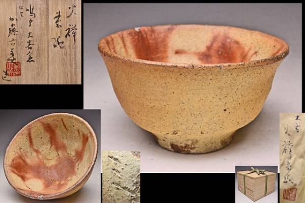 加藤六美 ★ 緋襷 茶碗 ★ 共箱 共布 ★ 鳴門大谷窯 にて ★ 数寄者 ★ 希少 ★