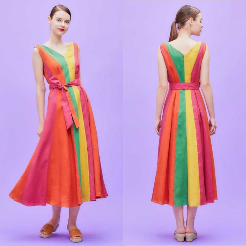 カラフルな切り替えが美しいリネンドレス。明るい配色の切り替えが目を引き、主役の1着です。ウエストにかけて絞るパターンは女性らしさを引き出し、シビラならではのシルエットが完成しました。配色のウエストベルトなどその日の気分に合わせて着方を変えていただけます。