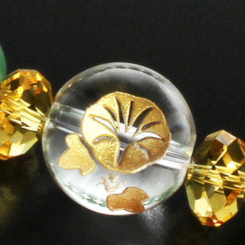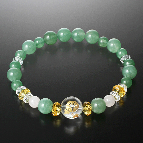 素材:白水晶1個(12mm珠 朝顔刻印)、6個(6×3mm/カット)、黄水晶4個(8×4mm/カット)、ローズクォーツ2個(6mm珠)、アベンチュリン10個(8mm珠)、8個(6mm珠)
