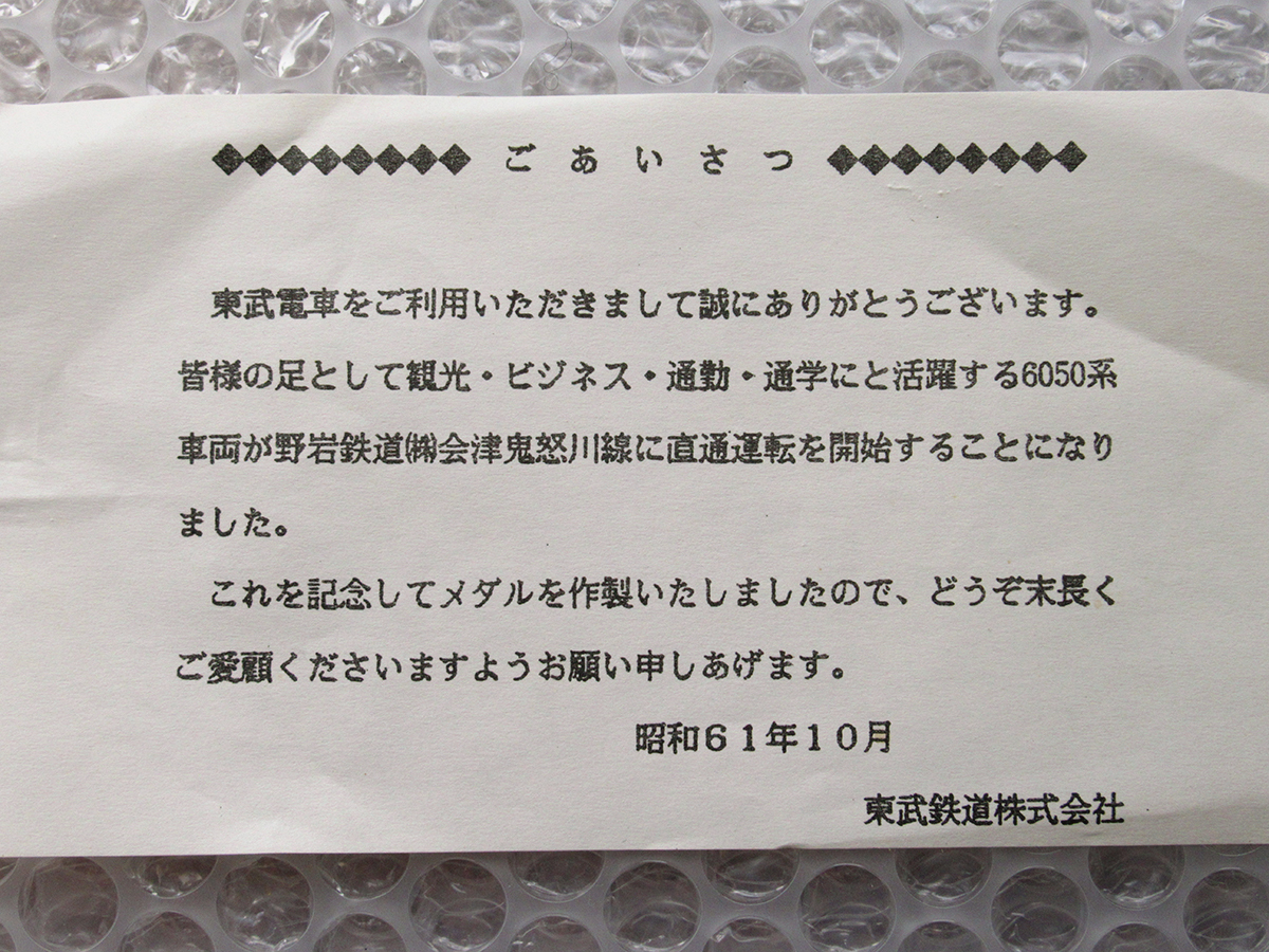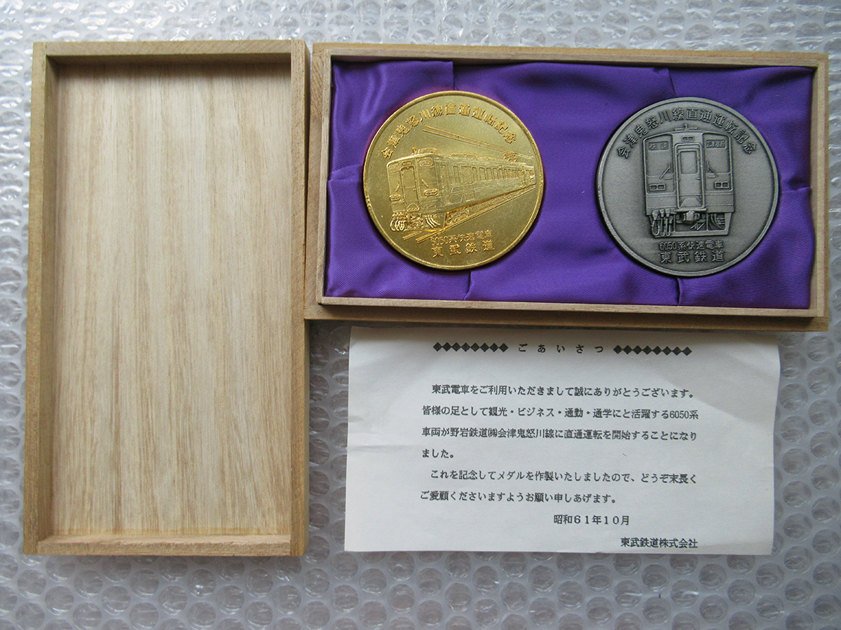東武鉄道 会津鬼怒川線直通運転記念メダル 昭和61年10月