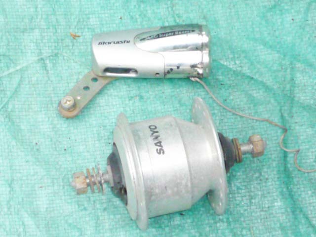 | ★商品説明★ | ★携帯からご覧の方及び発送料を聞く方がいらっしゃいますが送料等発送情報等下にありますので最後までよくお読み下さい。 ★評価の悪い方及び新規の方のご入札は1度質問コーナーよりご連絡下さい。 ご連絡の無い方のご入札はイタズラ・トラブル防止の為此方の判断で削除する場合がありますご了承下さい。 ★宅配便発送分及びゆうパックの場合必ずお読み下さい★ ※集荷・配達不可地域につきましては、予告無く変更となる可能性がございます。 お急ぎの方、遅延にご理解いただけない方は入札ご遠慮ください。ご落札の方には、 状況が判明次第ご連絡をさせていただきます。 大変ご迷惑をお掛けいたしますが、ご了承の程よろしくお願い申し上げます。 ★バイクや自転車・車の部品は消耗品です。完全クレーム対応致しません。保証等お考えの方はお店で整備された物を ご購入下さい。現状販売です。(現状販売の意味の判らない方はご遠慮下さい。) ★商品の詳細は文字では説明出来ない部分が有ります。ごくまれに、説明文に無い等アゲアシ取りをされる方 や神経質な方は、ご遠慮下さい。ご入札は良くお考えの上宜しくお願い致します。 ★動作確認済み。 ★27インチのホイールから取り外しました。 ★スポークの長さ:26インチの場合約27cmのスポークが要ります。 ★スポークの長さ:27インチの場合約29cmのスポークが要ります。 ★スポークの長さ:28インチの場合約29cmのスポークが要ります。 ★ライト:maruishi 3LED Super Beams。焼け・くもり・キズ・シミ・メッキ剥がれ有り。 ★ダイナモ:サンヨー。スポークを入れる所サビ有り。キズ・サビ有り。 ★ネジ類:サビ大ですのでおまけとお考え下さい。要らない方は落札の際お申し付け下さい、外してお送り致します。 ★スポークを入れる駒数36です。 ★このままでは使用出来ません。取り付けは専用のスポークが必要です。 ご自身の駄目になったダイナモのホイールがあればそのスポークで張替は可能です。 ★スポークを張り替えて実際に自転車に取り付けるときの注意点を下記に記します。↓ ★取り付けのコツは締めすぎず緩すぎず車輪が違和感無く回る様に取り付ければ大丈夫です。 ゴリゴリ音があれば締め過ぎです、その時はライト点灯しません。 ★前輪を締めるコツですがナットに負荷がかかりきつくなった時1回又は2回程クッかクックッとご自身が負荷が かかる状態がだいたい10kg前後ぐらいの最良な締め付け具合です。 これを覚えると家電・タイヤ交換等回して締める物は大抵大丈夫です。(全般に保証している物では有りません) ★自転車・車バイクの様に不安が有る物は外れたら怖いと過剰に力が入り結構きつく締める場合が 心の中で知らず知らず生まれます。お気を付け下さい。 ★一番判る判断テストは上下逆さま(反対にして)で車輪を指で軽く回します。 その時ゴリゴリに締めますとカックンカックン・1マスメ~2マスメ間隔等に カカクンカカクンと車輪の負荷がかかり上手く回らない車輪が止まる状態が締めすぎです。 早く・強く回すと判りづらいです。ユックリとお願いします。 ★正常は指で軽く回しますと普通に違和感無くスーット車輪が回ります。 その際明るい内はライトのセンサー部分の本体後に携帯のカメラ部分のような窓が有りますのでここを押さえ光を センサーに関知させないで行うと点きます。 ★結構敏感で精密な部分ですのでビニールテープの黒かガムテープ・黒の布等で塞がないと関知して明るい内は 点灯しません。夜であればそのままで点灯します。 ★大事な事ですがホイール(ダイナモ)とライトの線がちゃんと繋がっていなければ付きませんお気お付け下さい。 ★LED以外稀にライトの中にある銅版にライトが接触してなければ球を交換しても付きませんので銅版を軽く曲げて 球に接触するようにして下さい。球は消耗品ですので切れている時は交換して下さい。対応は致しません。 ★テストはスチールのフロントフォークでしておりますアルミ等特殊な物は点かない可能性が有りますので ネット・自転車屋さん・判る方に聞いた上でご入札お願い致します。その際安易に落札され点灯しない等 一切返品・返金等対応致しませんのでご了承頂いた方のみ宜しくお願い致します。 ★全体に年相応のサビ・キズ有ります。 ★発送は記載されているのみです。他の発送は不可になります。梱包代を含んだ金額になりますので、 ご理解頂いた方のみご入札下さい。実際の重量とは異なります。 ★割れ欠け見当たりませんが細かい部分は未チェックですので大事な部分はご質問で確認して下さい。 ★質問で確認のない欠け割れ部分は対処致しませんのでお気を付け下さい。 ★全体にキズ・シミ・サビ等有ります。部品取り・塗装等してお使い下さい。 ★評価の悪い方及び新規の方のご入札は1度質問コーナーよりご連絡下さい。 ご連絡の無い方のご入札はイタズラ・トラブル防止の為此方の判断で削除する場合
