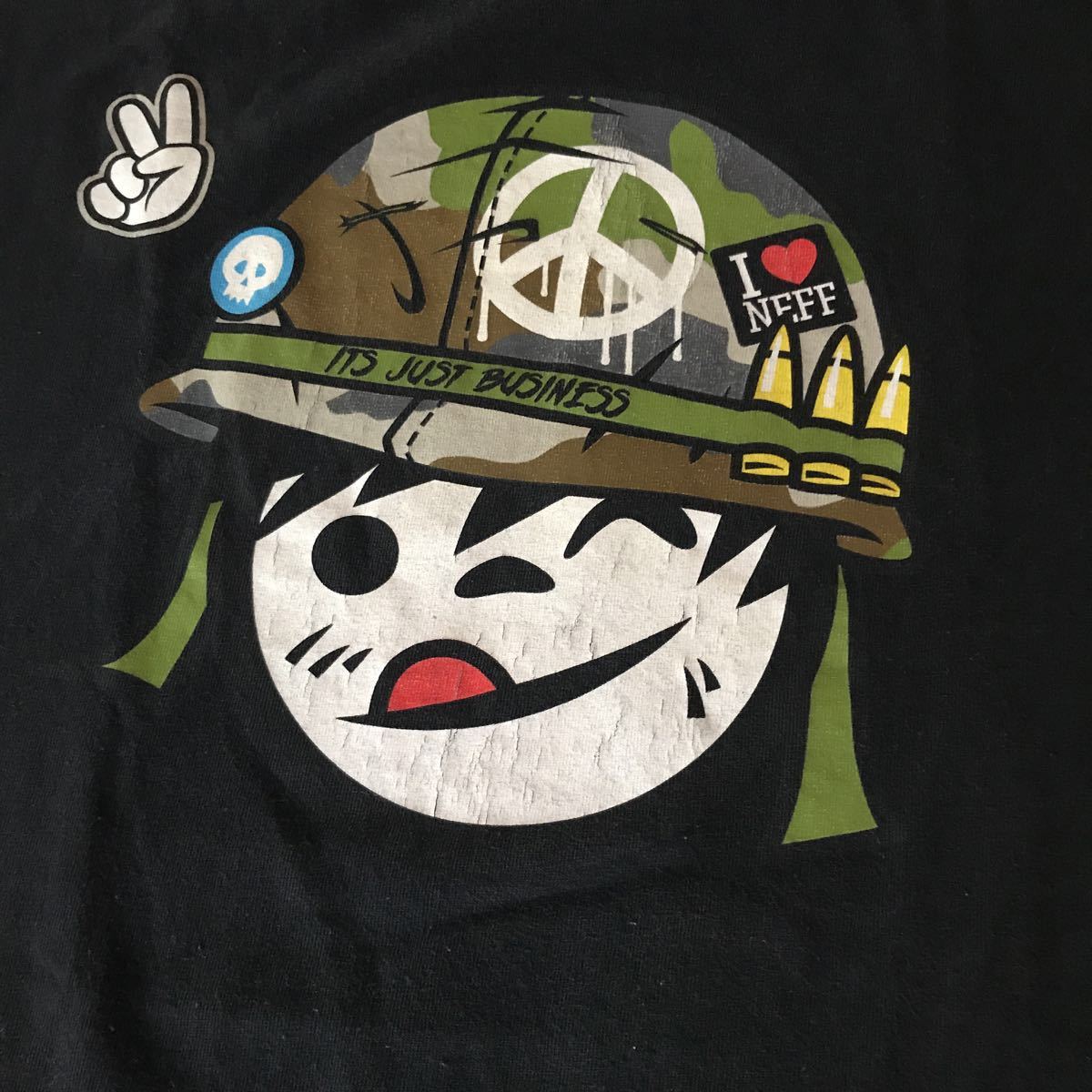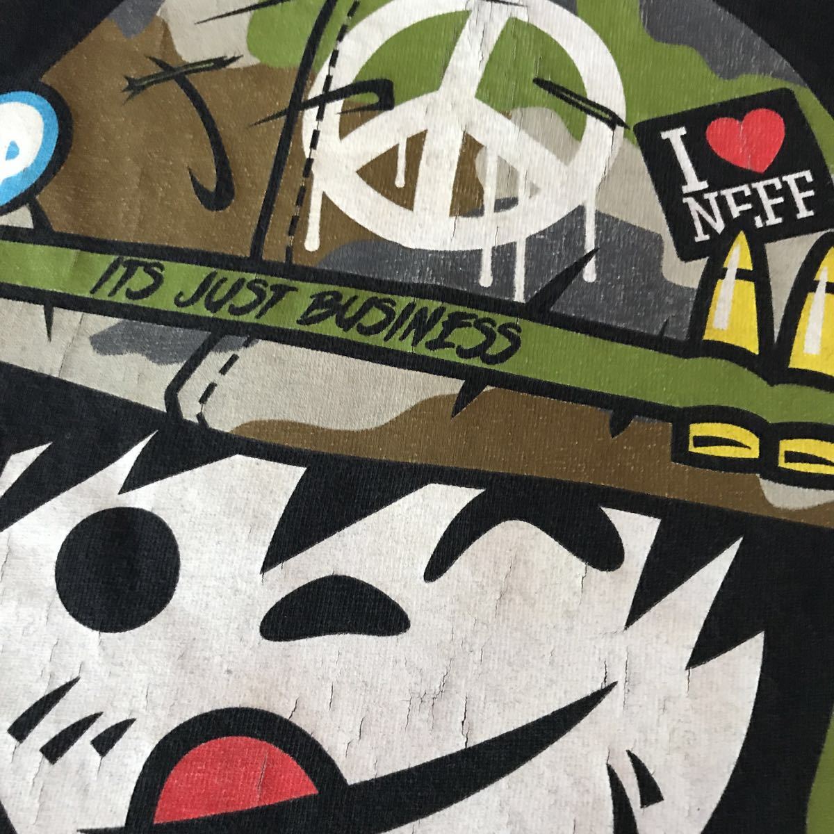素人採寸ですので、多少の誤差が生じる事をご了承下さい。着丈約70.5cm・肩幅約52.5cm・袖丈約21cm・身幅約54cmです。新品ではございませんが、古着にご理解ある方でしたら 問題ないレベルです。プリントのヒビ割れが始まっていますので、神経質な方の入札はご遠慮下さい。確認はしているのですが、写真撮影時、シミ・汚れ・ほつれ・小穴等見落とす事がありますのでご理解下さい。個人出品ですのでノークレーム・ノーリターンで宜しくお願い致します。