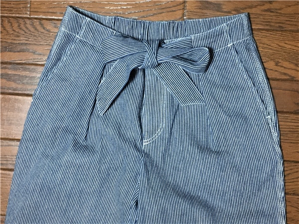 平置きでウエスト上部を測りまして37cm、股下57cm、裾幅22.2cm、総丈84.5cm、腿幅(股の付け根部分)33.2cm、股上30.5cmほどになります。