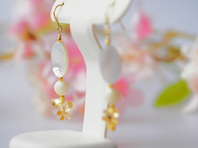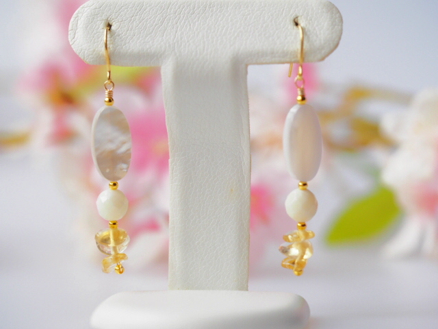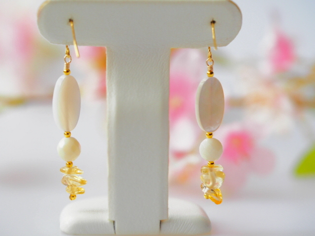 こちらはホワイトクォーツァイトにホワイシェル、シトリンを組合わせたピアスです。