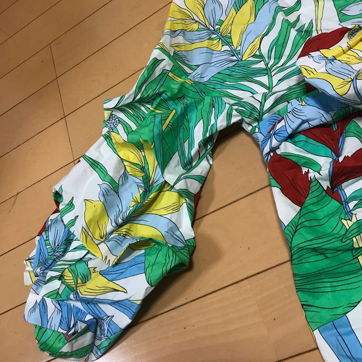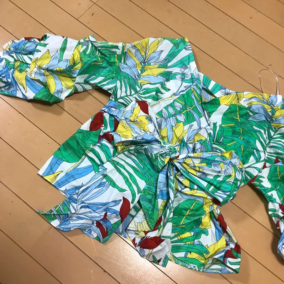 ◆ショップの方にはカシュクール部もリボンも前後どちら側でも着用可能とのことでした♪前を着物の様に合わせて腰横の穴にリボンを通して自分で絞り具合を調整してリボン結びにします♪袖のクシュクシュデザインもオシャレ♪綺麗なカラーのボタニカル柄がホワイトやデニムのボトムスに可愛い