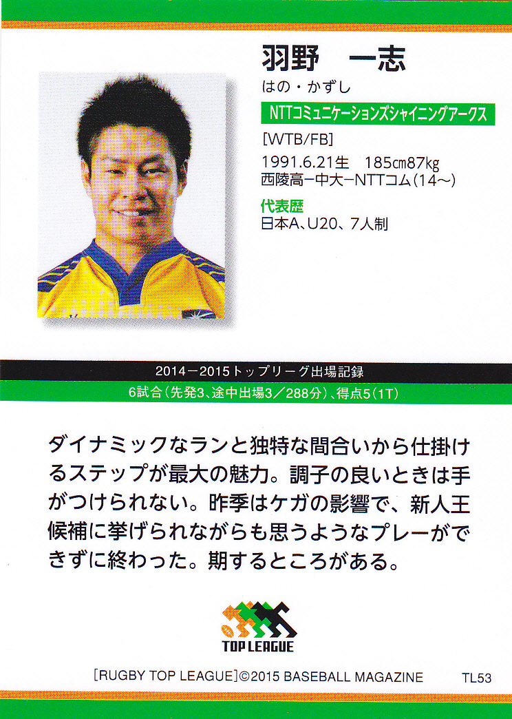 BBMラグビートップリーグ2015-2016 TL53 羽野一志 NTTコミュニケーションズシャイニングアークス 愛知県 名古屋市 西陵高校 中央大学
