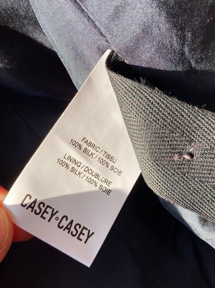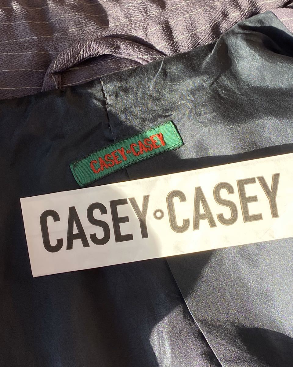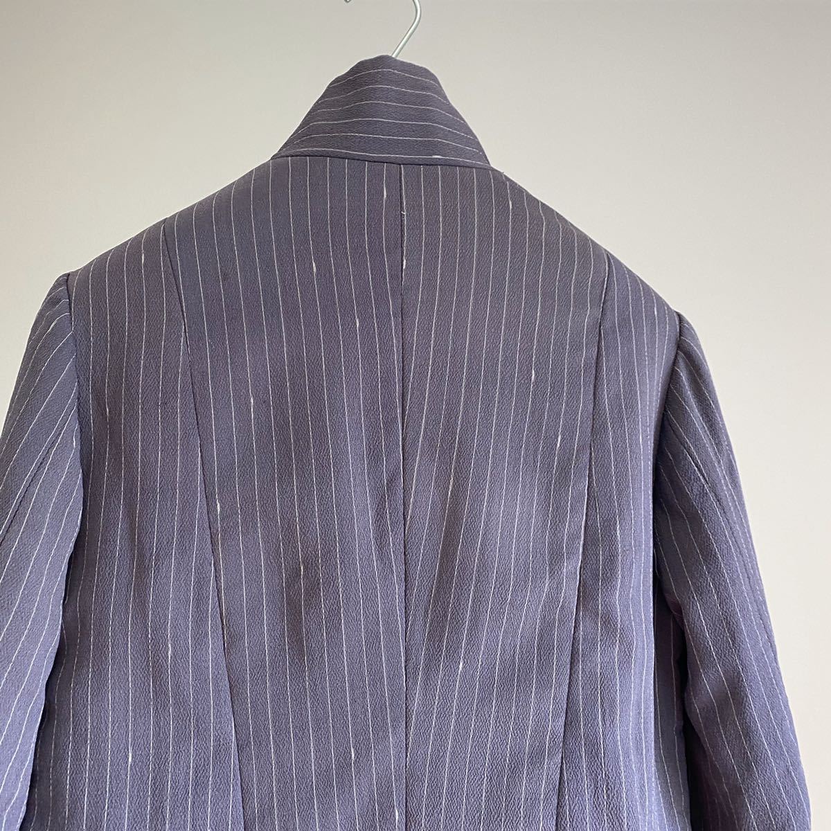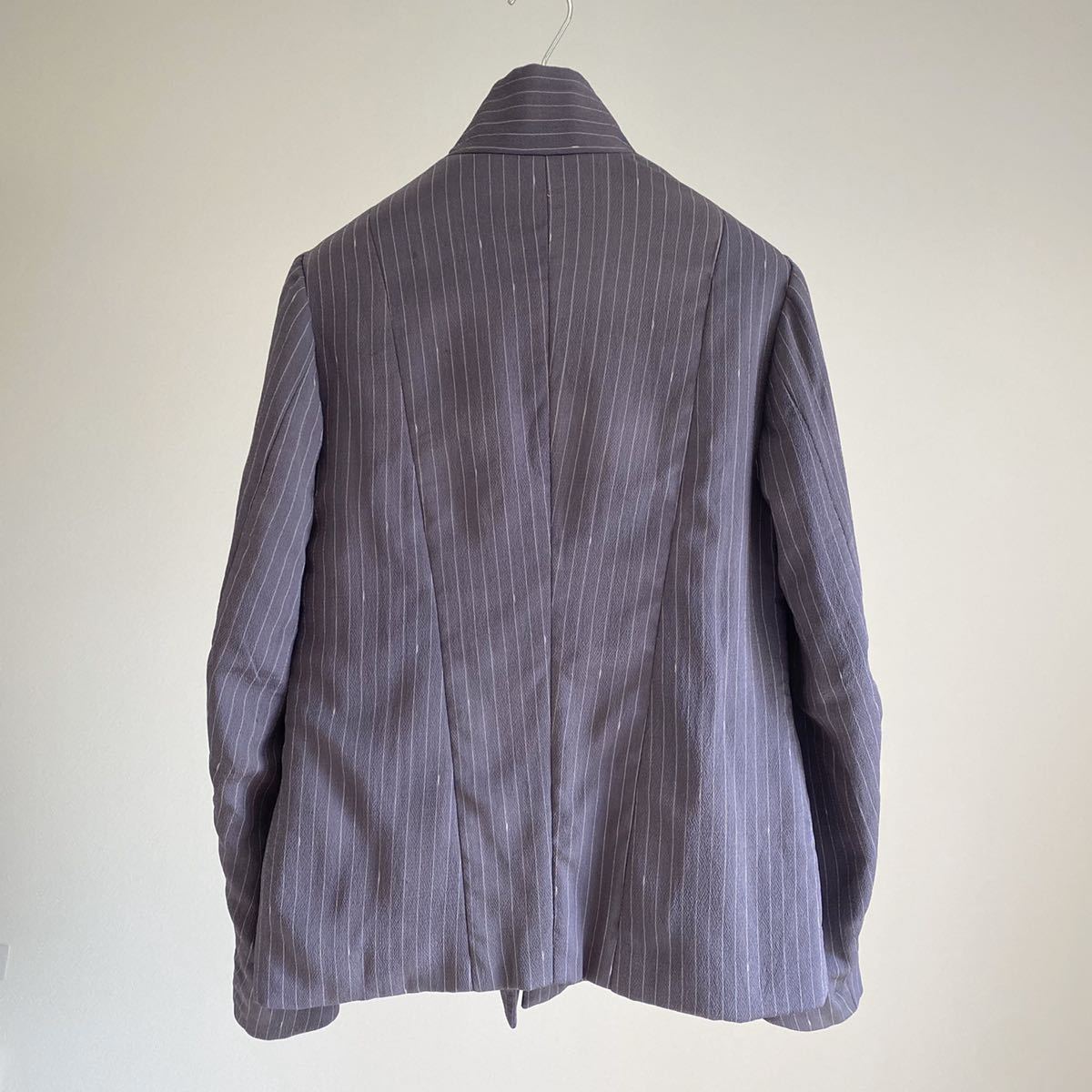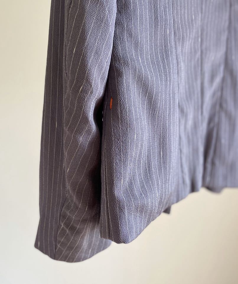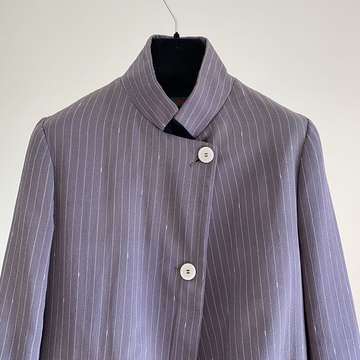 色味も灰色がかった紫で、やや侘びた佇まいからは古着のような印象も受けます。近づくとシルクの光沢感と表面の細かな凹凸、アクセントの入った縦縞など作り込みが見え、その価値を再発見する感覚があります。