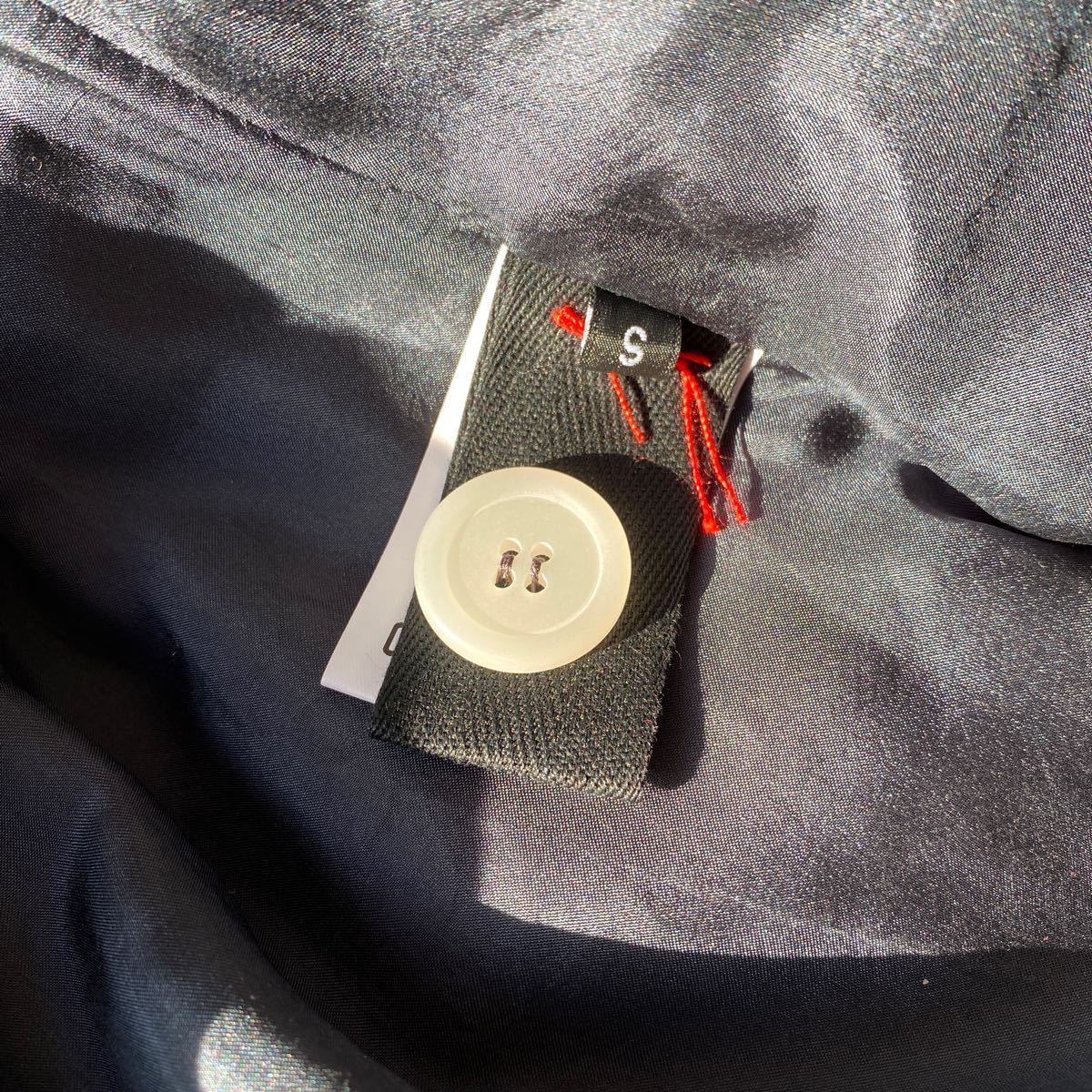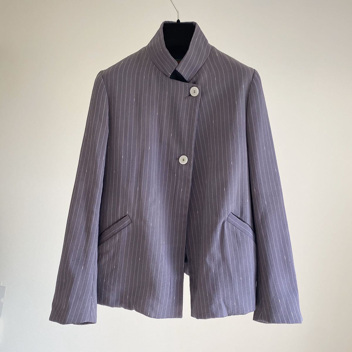 着物に使われる生地を用いたアイテムで、アシンメトリーな前合わせにスタンドカラー。