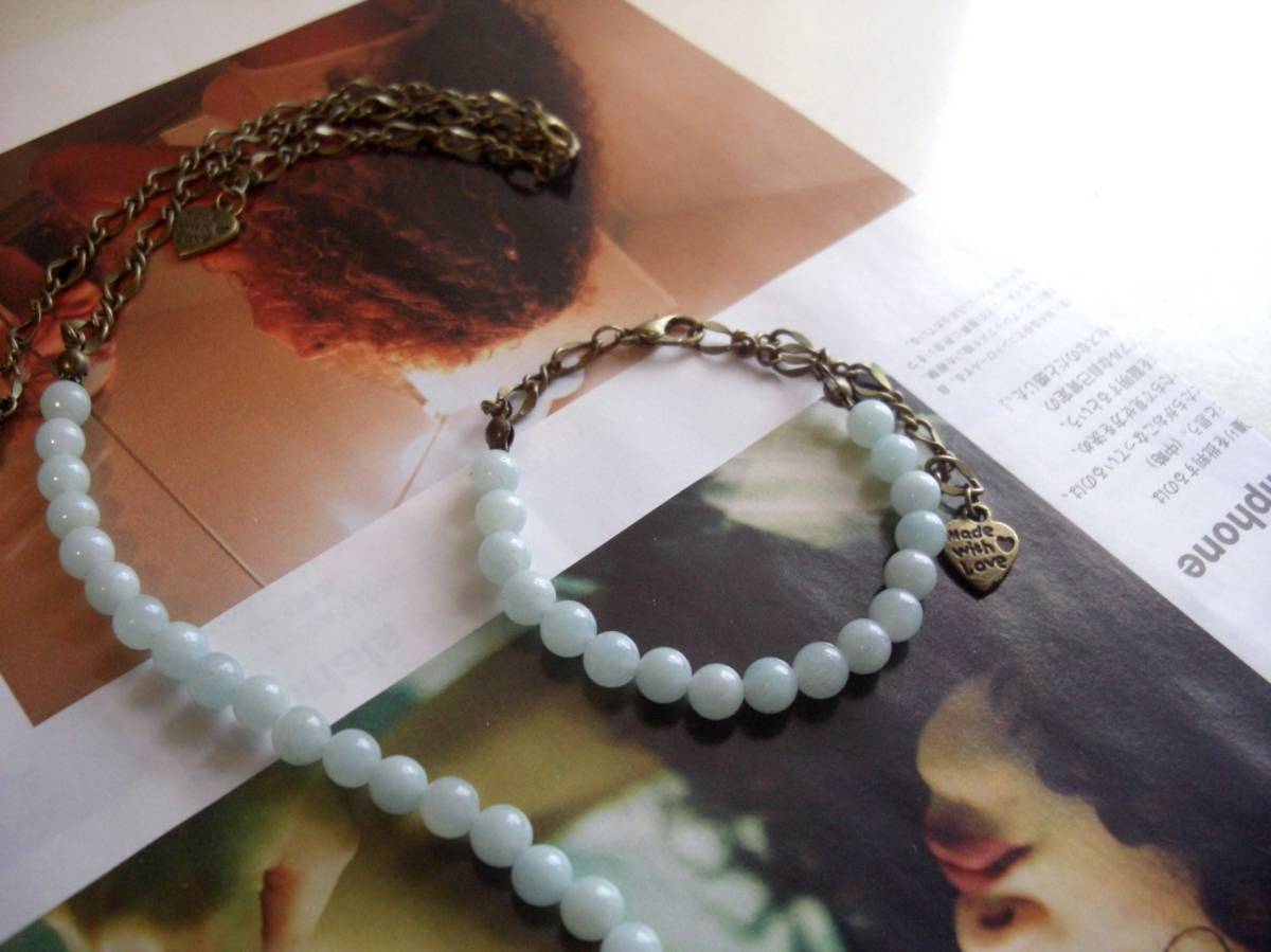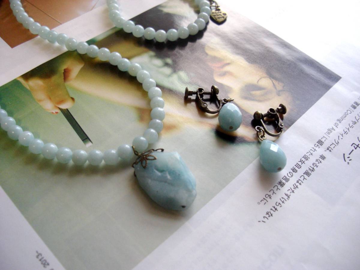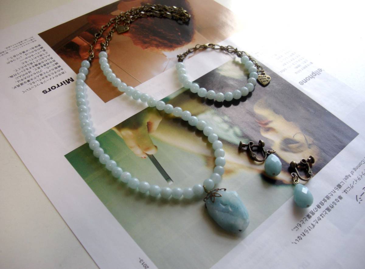 大人色に魅せられて・・シリーズです♪神秘的なアマゾナイトの一揃い・・可憐な水色のアマゾナイトのネックレス、ブレスレット、イヤリングの3点セッ トです♪丸玉やラフカット、ドロップカットなど大きさ違い、デザイン違いのアマゾナイトにデザインチェーンを合わせてモードな表情です♪色々なシーンで楽しんでいただけます♪♪ネックレスは6ミリの丸玉に座金でおめかしした20ミリ×25ミリ位のラフカットのアマゾナイトを合わせました♪長さは全長 62センチで調節自由です♪6ミリの丸玉のアマゾナイトのブレスレットは全長22センチ位で調節自由です♪イヤリングは10ミリ×15ミリ位のドロップカットのアマゾナイトです♪長さは3・5センチくらいです♪ピアスに変更も出来ます♪お揃いのシリーズも出品しています♪ハンドメイドを ご理解頂いてノークレーム、ノーリターンでお願いします