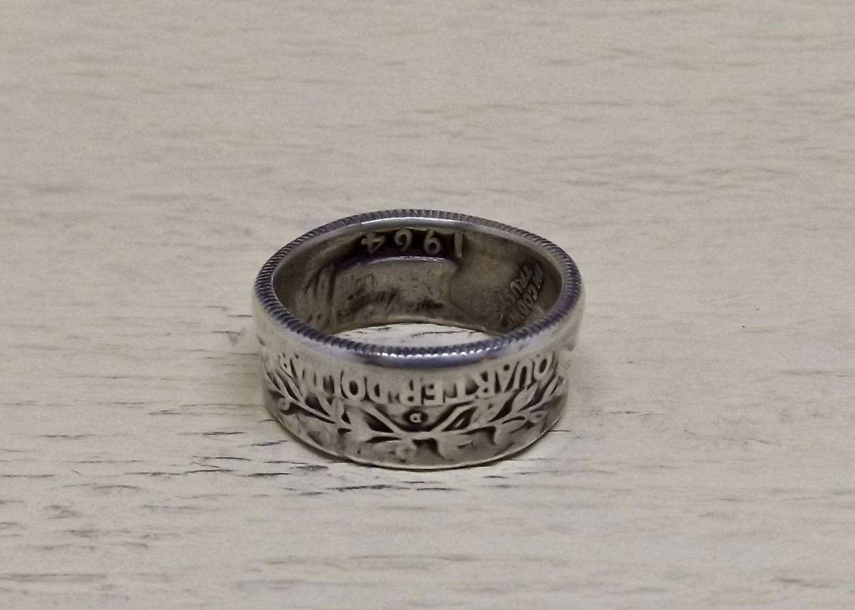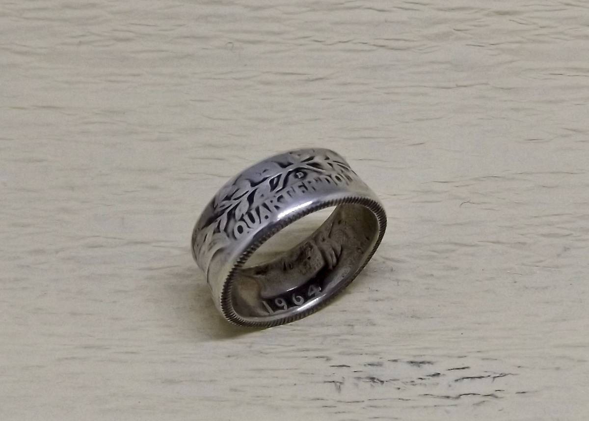 この商品は、1964年の25セント銀貨を使い、ハンドメイドにより作成     銀貨に穴を明け  木槌で叩いてコインリングに成形した1点物です。LIBERTY INCODWE TRUST ワシントンの肖像 UNITED STATES OF AMERICA