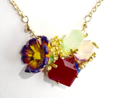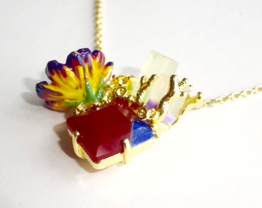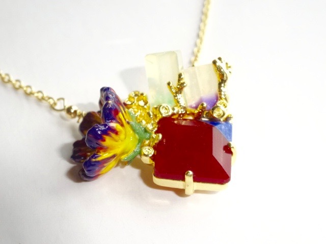 パープルストーンを中心にグラデーションのお花と珊瑚のようなデザインの透明に近いグリーンとピンクのストーンがはめ込まれています。