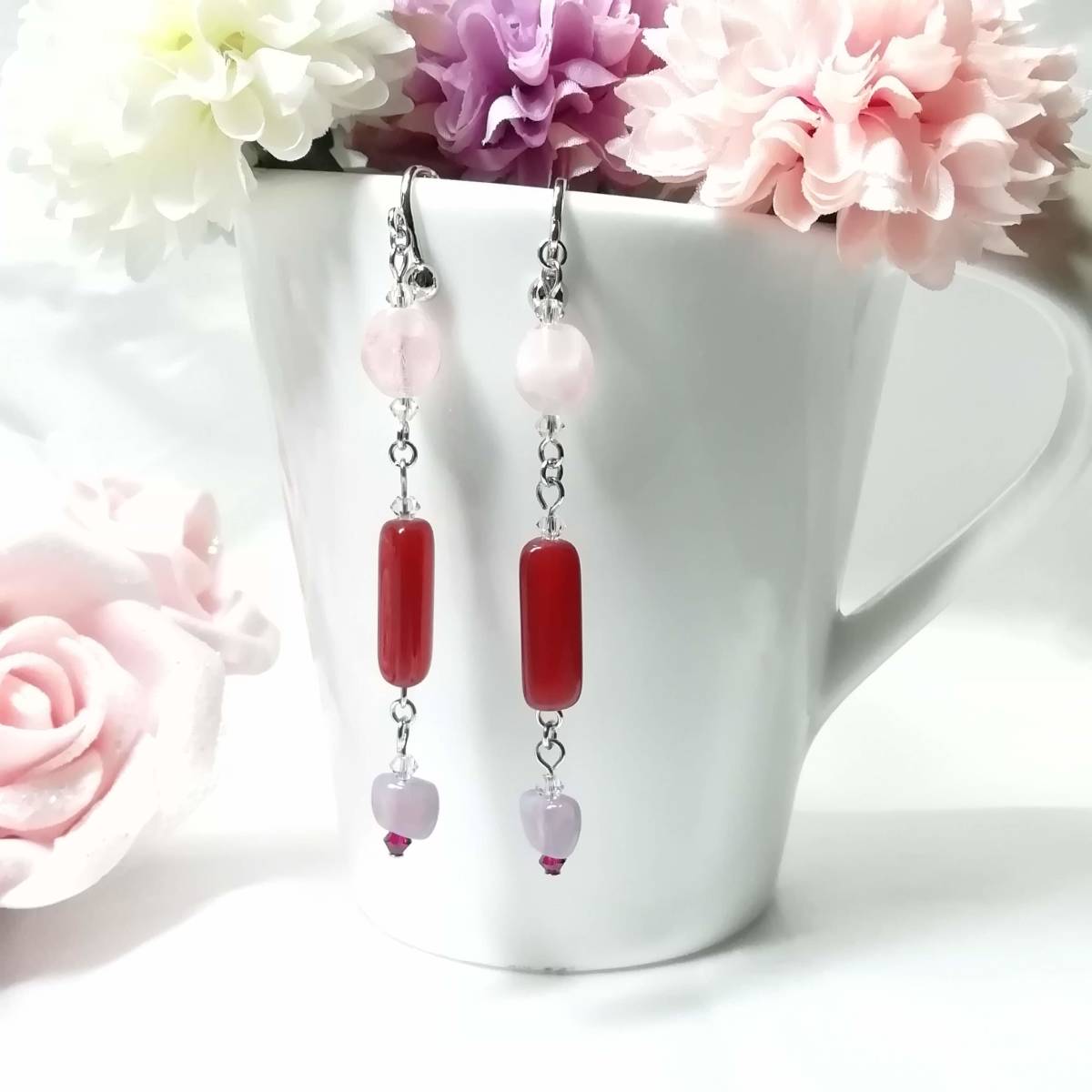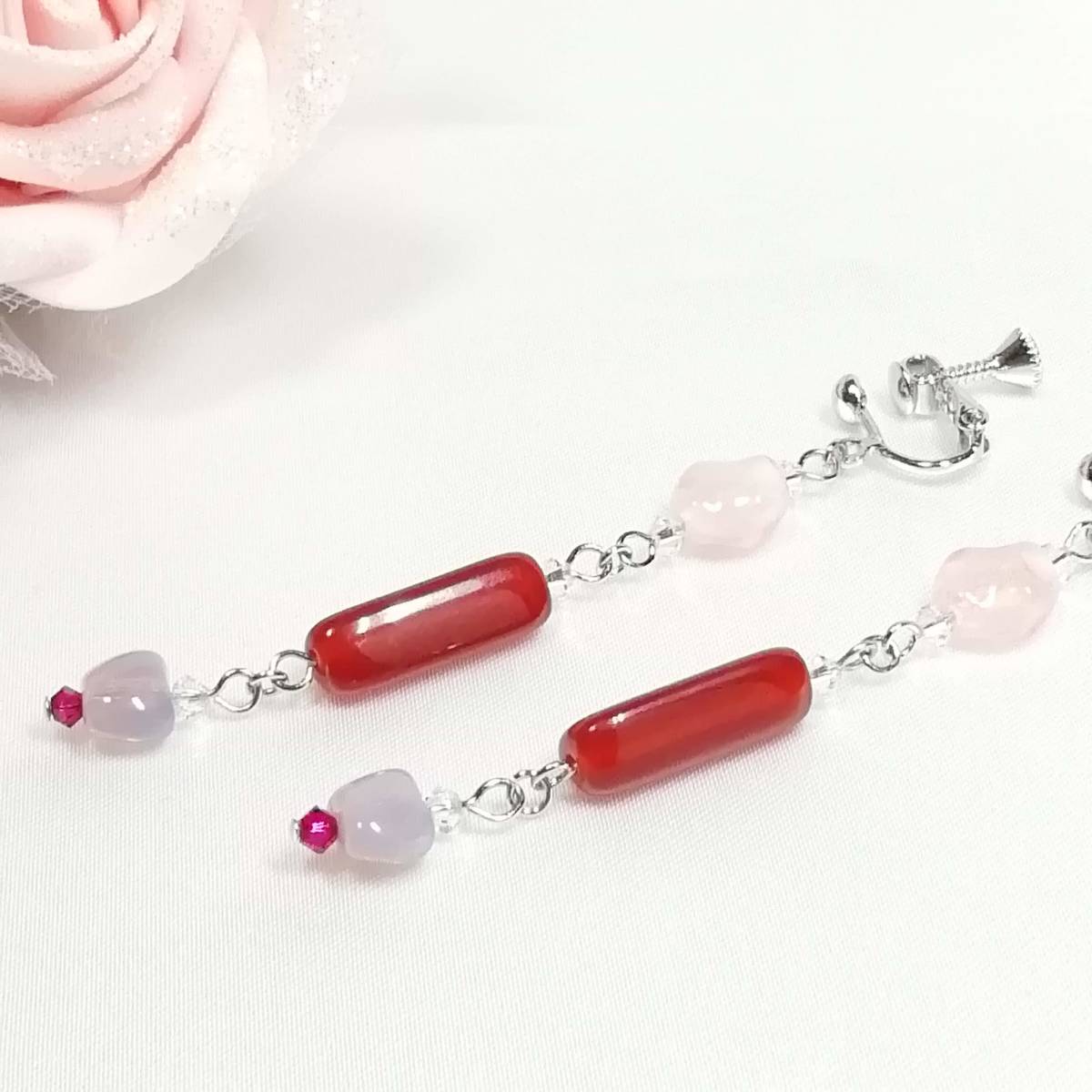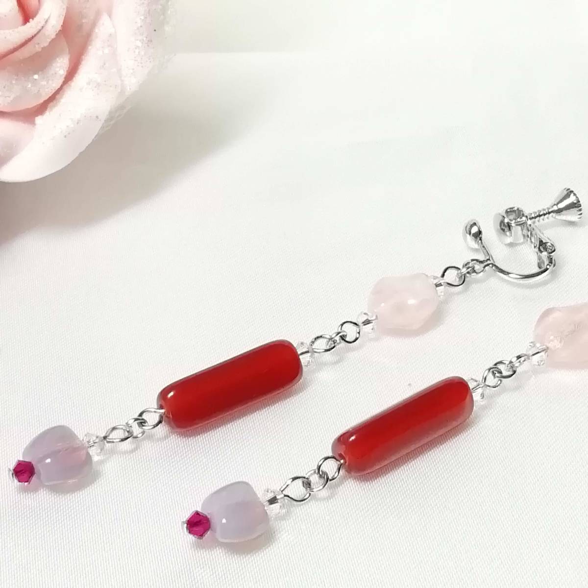 ★商品内容★ ★三角柱カーネリアンのハンドメイドイヤリング★フランスビーズ/チェコ/上品/個性的/シルバー/赤茶色/クリスタル/ルビー/薄紅/赤/薄紫 個性的な形のビーズとシックな色合いが 上品で落ち着きのある女性らしさを印象付けます*・.**.・。**.・。*・.**。・ まったりとしたカーネリアンの濃い紅色と シルバーパーツの組み合わせがアンティークな雰囲気を醸し出しています*・.**・.・。**.・。*・.**。・ 普段使いはもちろん、オフィスにも、 お出掛けやお洒落のワンポイントなどにも最適です・。**.・。*・**。・. 【素材】 fromフランスオパールアメジスト8mmx6mm fromフランス三角柱カーネリアン18mmx6mm チェコビーズブレストオーバルピンク9mmx8mm スワロフスキー5328クリスタル(オーストリア製)3mm スワロフスキー5328ルビー(オーストリア製)3mm カンより垂れ下がる長さは、約6.5㎝です。 Eー649 ★注意事項★ ***~ご購入前に必ずお読み下さい~*** *・*・*落札後について*・*・* *落札後4日以内にお手続き、ご連絡が無い場合は落札者都合で削除致します。 *発送日指定・ご入金の予定が1週間以上先をお考えの方は、入札の前に質問よりご連絡くださいませ。 予めご了承の上、ノークレーム・ノーリターンでお願い致します。 *・*・*商品について*・*・* *一点一点心を込めて作っておりますが、手作りなため多少の歪み等あるかもしれません。 手作りの味わいと、世界で一つだけの作品とお考えいただければ幸いです。 *デリケートな商品ですので、強く引っ張ったりすると破損する事もあります。 お取り扱いにはご注意ください。 *ご覧のPC、スマホによっては画像と実物の色味が多少異なる場合があります。 *基本イヤリング金具は跳ね上げネジ付き金具にて作成しております。 **ご希望によりピアスへの変更も承っております。 【フックピアス…無料/キャッチピアス…別途追加料金120円】 *その他…樹脂ノンホールピアス(無料)・カン付き樹脂ノンホールピアス(別途追加料金20円)にも変更をお受け致します。 ~ご注文の際にメッセージ欄よりお申し付け下さい~ 尚、金具変更のご希望が無い場合は、掲載された写真の金具にてお送り致します。 *金属アレルギーや化学物質アレルギーへの対応はしておりませんので、ご心配な方はご遠慮下さいますようお願い致します。 *永くご愛用頂くために、ご使用後は柔らかい布等で軽く拭いてください。 *・*・*プレゼント用梱包のご要望もお受けいたします*・*・* *その際は、梱包費用が別途で必要となりますのでご注意ください。 また、ご希望の梱包タイプによって、発送方法が変わりますので、送料が別途必要となります。 プレゼント用梱包タイプ 【袋→100円】 発送方法【クリックポスト(送料無料)】 プレゼント用梱包タイプ 【箱→200円】 発送方法【レターパックプラス(別途520円)】 袋タイプは【合計100円の追加料金】、箱タイプは【合計720円の追加料金】となります。 ◆ご希望の場合は、必ず商品ページをウォッチリストに登録した上で落札前に質問にてお問合せ下さい。◆ ◆ご希望を承り次第、一度出品を取り消し、プレゼント用梱包費用、送料などを追加した金額へ変更し、再出品致します。◆ *再出品後に再度検索して頂く手間が省けますため、プレゼント梱包をご希望の場合は必ずウォッチリストへのご登録をお願い致します。 金額変更後の再出品から3日以内に落札されなかった場合、誠に勝手ながら購入する意思がないとみなしまして、元の金額へ修正致します。 また、修正後、再度プレゼント用梱包のご希望のお問い合わせを頂きましても、お断りをさせていただきますのでご注意ください。 ご不明な点がございましたら、落札前に質問よりお願い致します。 ***ご質問について*** *ご購入前にお願い致します。 日中は仕事をしておりますので、ご返事が直ぐに出来ない場合がございます。 出来る限り早い対応を心がけますが、ご了承ください。 また、発送までには、お振込み確認後、翌日の発送を心がけておりますが、仕事の都合により2~3日程かかる場合がございます。(その際にはナビにてご連絡いたします) お急ぎの場合は、極力対応いたしますが、場合によっては対応致しかねる事もあります。ご了承下さいませ。 | |||