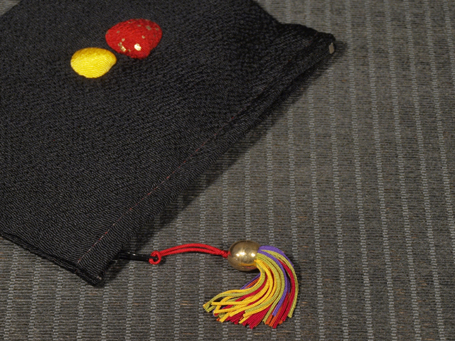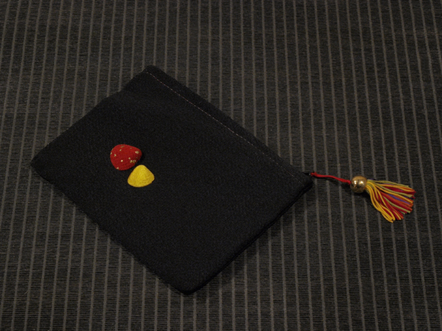 黒色の地に、縮緬地でくるまれた貝の細工が施された、縮緬の小物入れです。 使用感はなく、未使用保管品と思われます。しみやよごれ、褪色などのダメージもなく、新品同様です。 |