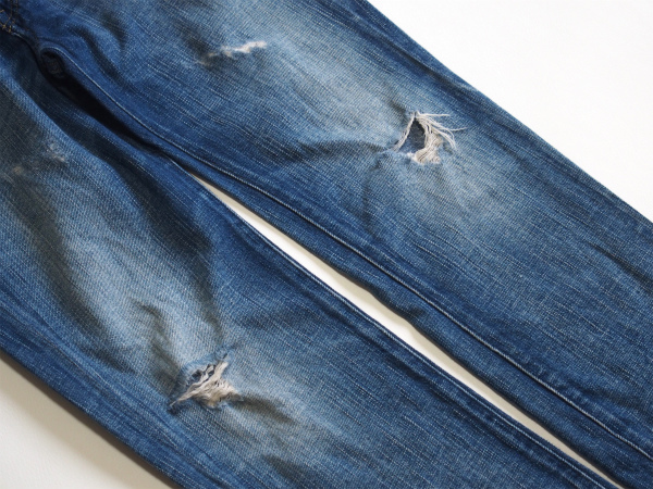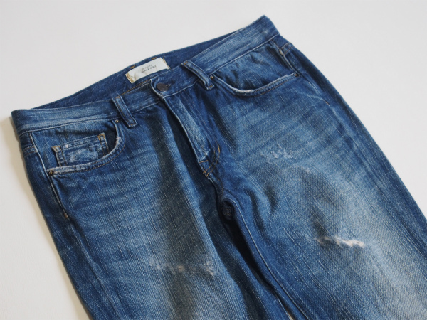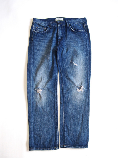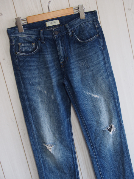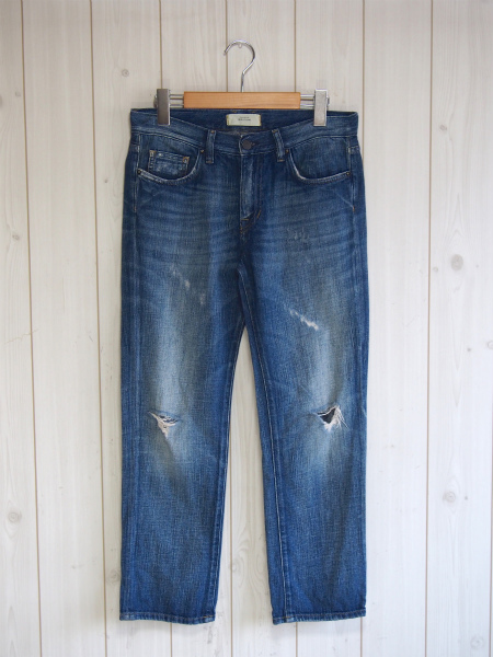 マウログリフォーニのダメージデニムです。 細すぎないテーパードシルエットで通常のデニムより若干、薄手で柔らかなストレッチ生地を使用しているため窮屈感がなくとても履きやすいです。 ダメージもやりすぎていませんのでトップスを選ばずお使いいただけます。チュジニア製のお品です。
