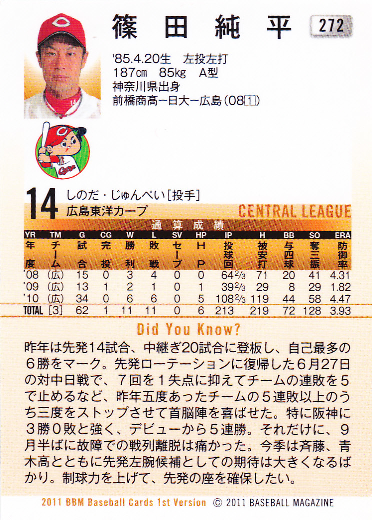 2011BBMベースボールカード1st 272 篠田純平 広島 神奈川県 前橋商業高校 日本大学 ドラフト1位