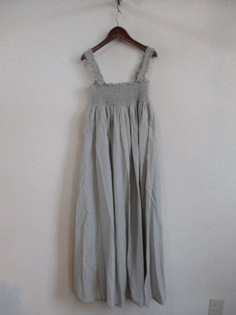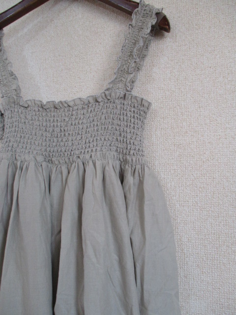| 商品紹介 | キャミソール型のロングワンピースです。 色はグレーの入ったベージュ(光加減によって薄いカーキのようにも見えます。)です。 肩紐と胸周りにゴムでギャザーが入っています。 胸下に切替えがあり、その下からは生地をたあっぷりと使ったふんわりとした デザインになっています。 肩紐は取り外して、ベアトップワンピースとしても着る事ができます。 ※微妙な色合いですので、気になる方は入札をご遠慮ください。 《素材》 表地:綿100% 裏地:ポリエステル100% |
