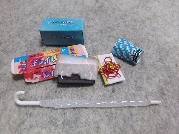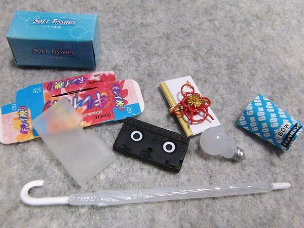 ■リーメント『ぷちコンビニ/うっかりさんの強い味方』です。ビデオテープや箱ティッシュ、祝儀袋にコンビニビニール傘、電球などのセット。重さは10グラムほど。現状渡しです。