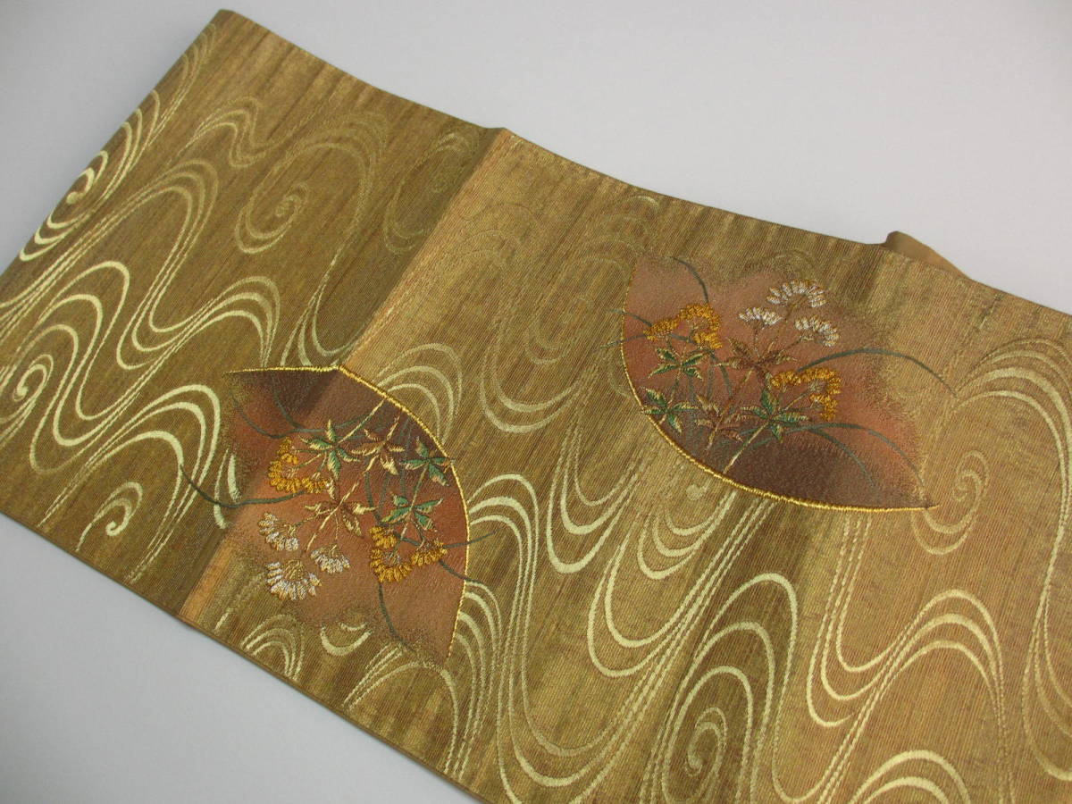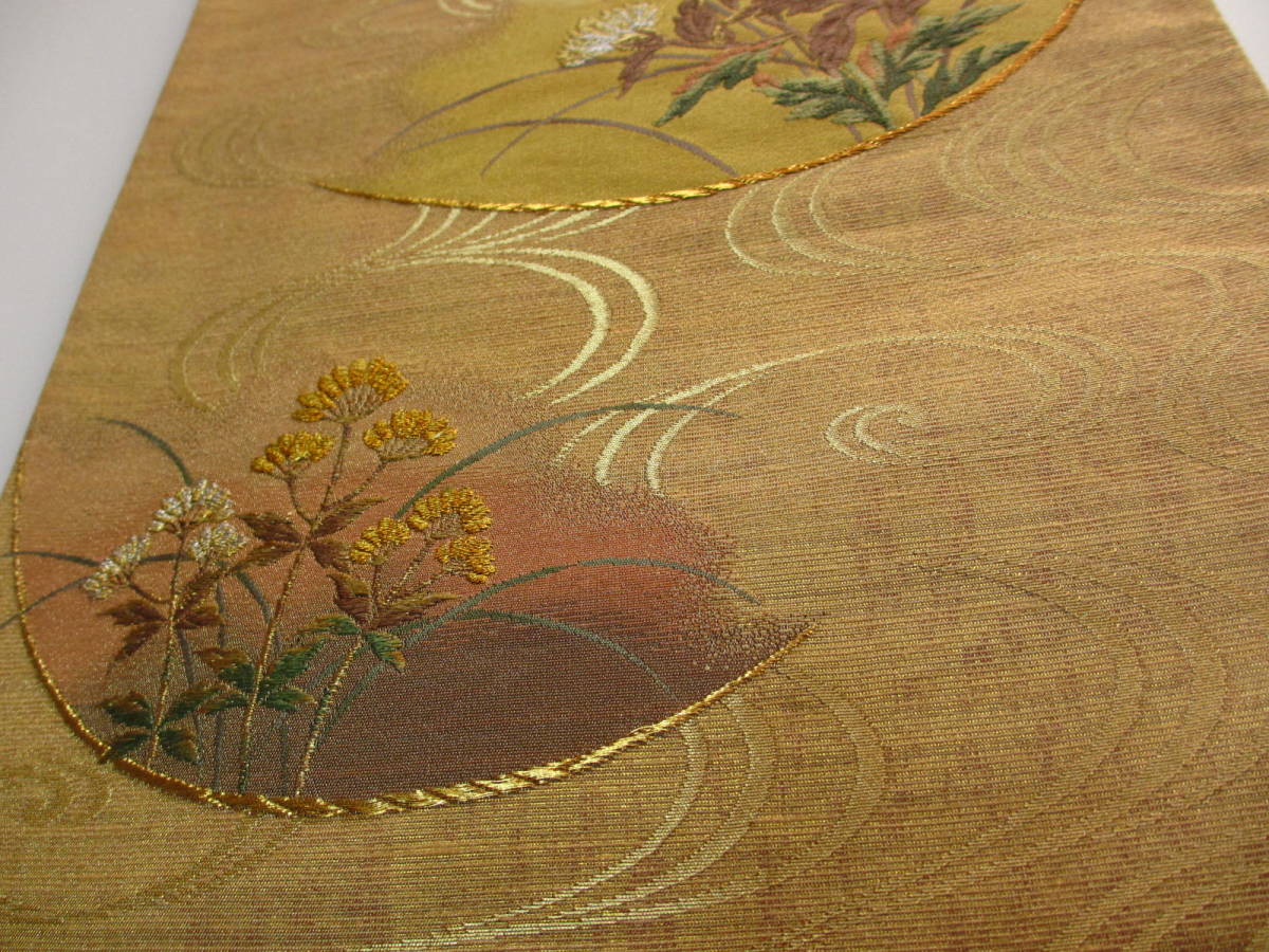 商品説明 | 水文の中に秋の草花をモチ―フにお洒落に織られた帯です。 (未仕立て品:絹・金銀糸は除く:45514970) 販売価格28万でした。 |