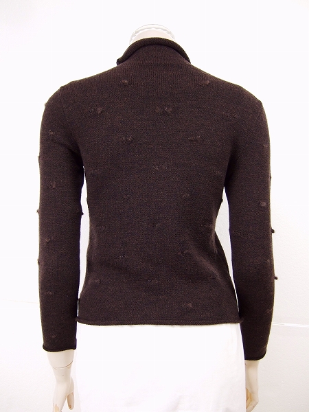 ![]() ![]() 落札後はオークション終了のお知らせメールに出品者からのメッセージが御座います。 自己紹介欄には急な休み等の記載をする場合が御座いますので一度お目通し頂きます様お願いいたします。ご一読の上オークション終了後2日以内の連絡、 落札後4日以内のご入金のお約束を守って頂ける方のご入札をお待ちしております。 小さい子供がおりますのでお急ぎのお取引を希望される方のご入札は遠慮下さいませ。 ---↓ここにブランド名記入---- ブランド名:三喜商事(株)イタリア製 ---↓ここに特徴記入---- 特徴:ブラウン系の上質な肌触りニットです。微艶チョコレートブラウン系に微かにコーヒーブラウン系が混ざり合う、毛足あるモヘア風のドットモチーフが上品にあしらわれたハイネックニットです。 ---↓ここにサイズ記入---- サイズ : 40 表示(細身です。Mサイズ相当)(トルソーは9号です) 実寸(平置き採寸) 肩幅37cm、身幅40cm、袖丈53cm、ウエスト37cm、着丈51cm、裾幅40cm、ネック部5cm ---↓ここに素材記入---- 素材 : ウール85% 裏地 レーヨン15%