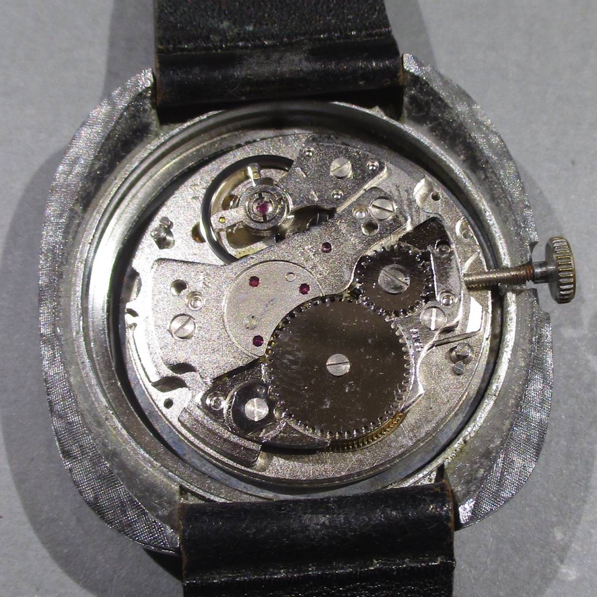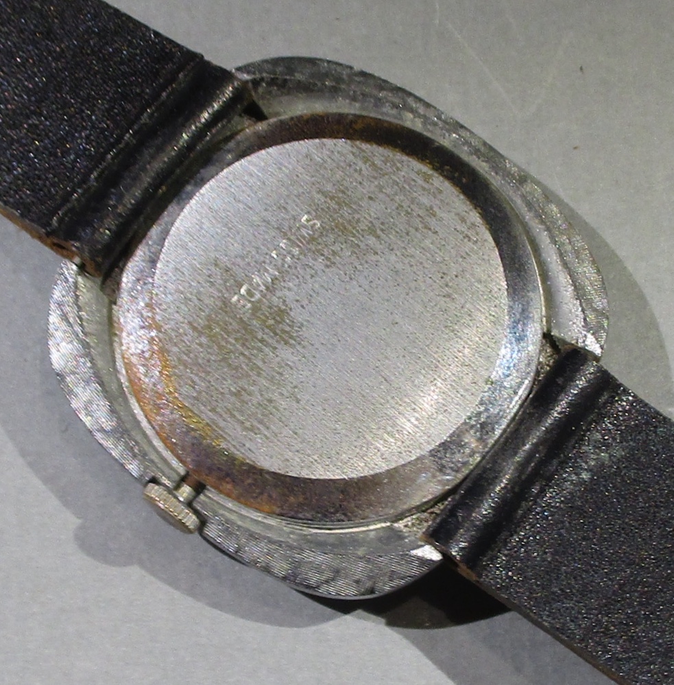 文字盤には縁に経年有ります。クッションケースには裏にメッキの摩耗有ります。風防には細かな傷有ります。社外ベルト。