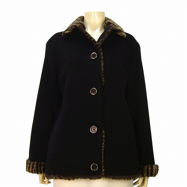 F 美品★ARABEL★黒*伊製(イタリア製)*優暖カシミヤ混ウール生地×毛皮ファー付き*高級ジャケットコート*42(XL*LL(2L)*13号相当)
