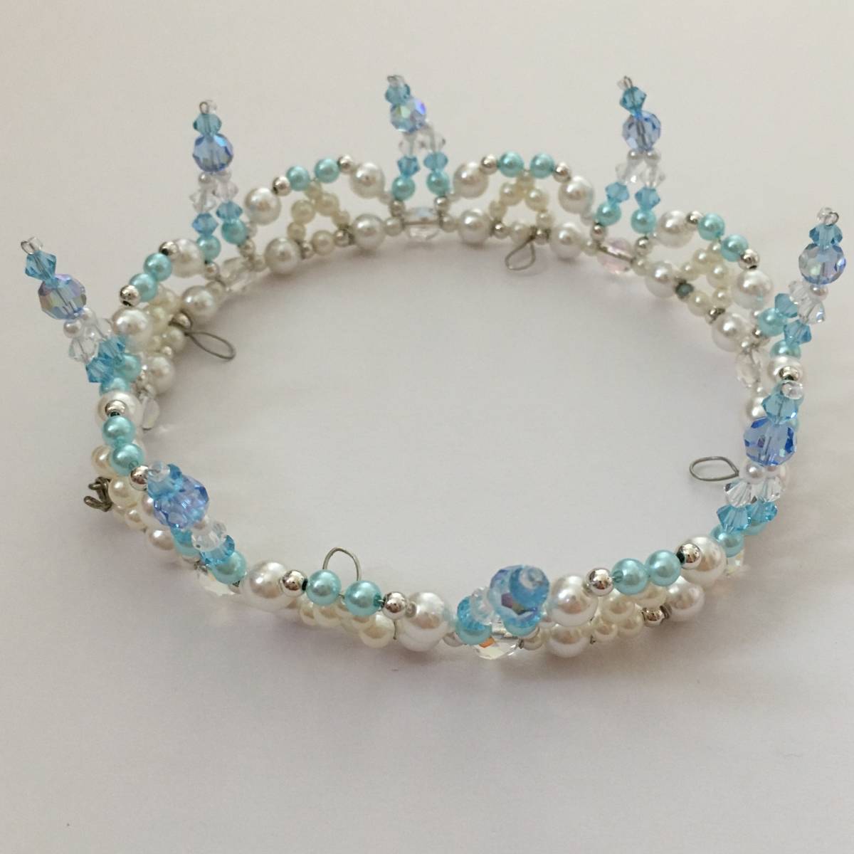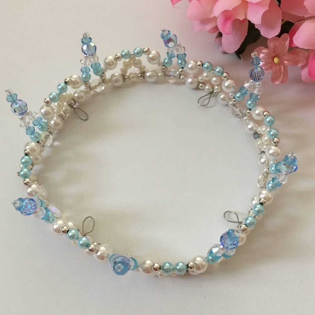 ハンドメイドのビーズアクセサリー小物です。 こちらは水色&白色 スワロフスキー&パールのティアラ (王冠)です。 直径約9cm,高さ約3㎝です。 ヘアピンで頭に留められるフックが4か所あります。 素人の作品ではありますが,丁寧にひとつひとつ作ったものになります。 右上のピンクの花は撮影用小物ですので商品には含まれません。 |